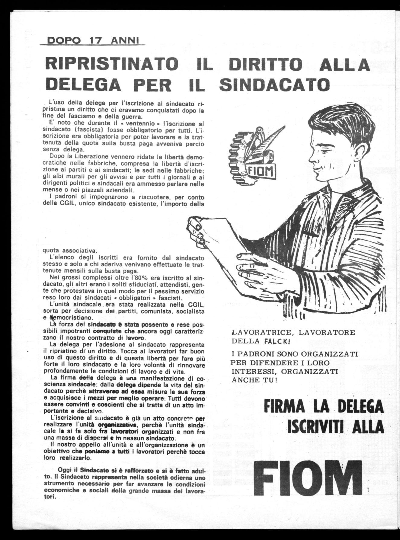 Dopo la Liberazione vennero ridate le libertà democratiche nelle fabbriche, compresa la libertà d'iscrizione ai partiti e ai sindacati; le sedi nelle fabbriche; gli albi murali per gli avvisi e per tutti i giornali e ai dirigenti politici e sindacali era ammesso parlare nelle mense o nei piazzali aziendali.
