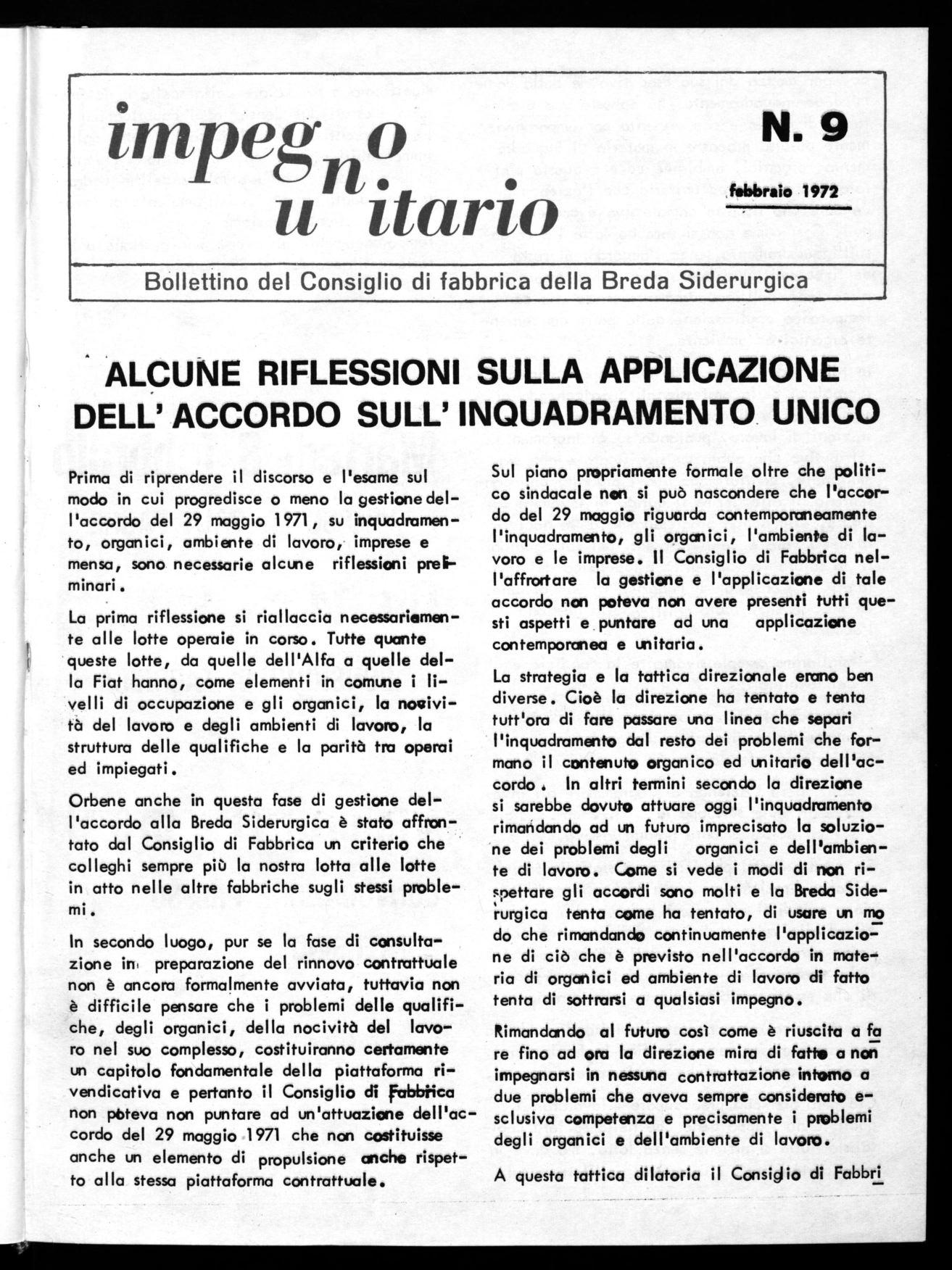 La strategia e la tattica direzionale erano ben diverse. Cioè la direzione ha tentato e tenta tutt'ora di fare passare una linea che separi l'inquadramento dal resto dei problemi che formano il contenuto organico ed unitario dell'accordo . In altri termini secondo la direzione si sarebbe dovuto attuare oggi l'inquadramento rimandando ad un futuro imprecisato la soluzione dei problemi degli organici e dell'ambiente di lavoro. Come si vede i modi di non rispettare gli accordi sono molti e la Breda Side‘rurgica tenta come ha tentato, di usare un mo do che rimandando continuamente l'applicazione di ciò che è previsto nell'accordo in materia di organici ed ambiente di lavoro di fatto tenta di sottrarsi a qualsiasi impegno.