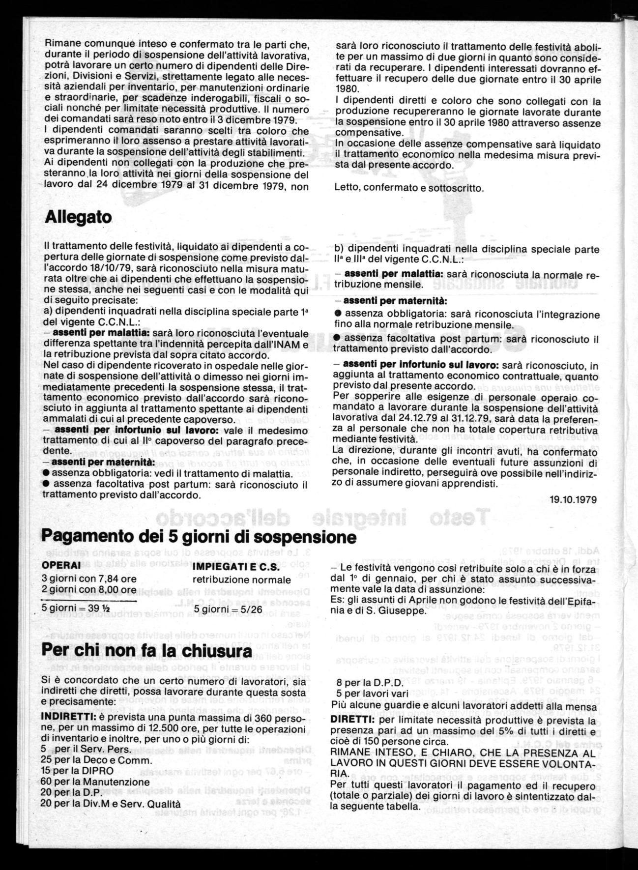 Per sopperire alle esigenze di personale operaio comandato a lavorare durante la sospensione dell'attività lavorativa dal 24.12.79 al 31.12.79, sarà data la preferenza al personale che non ha totale copertura retributiva mediante festività.