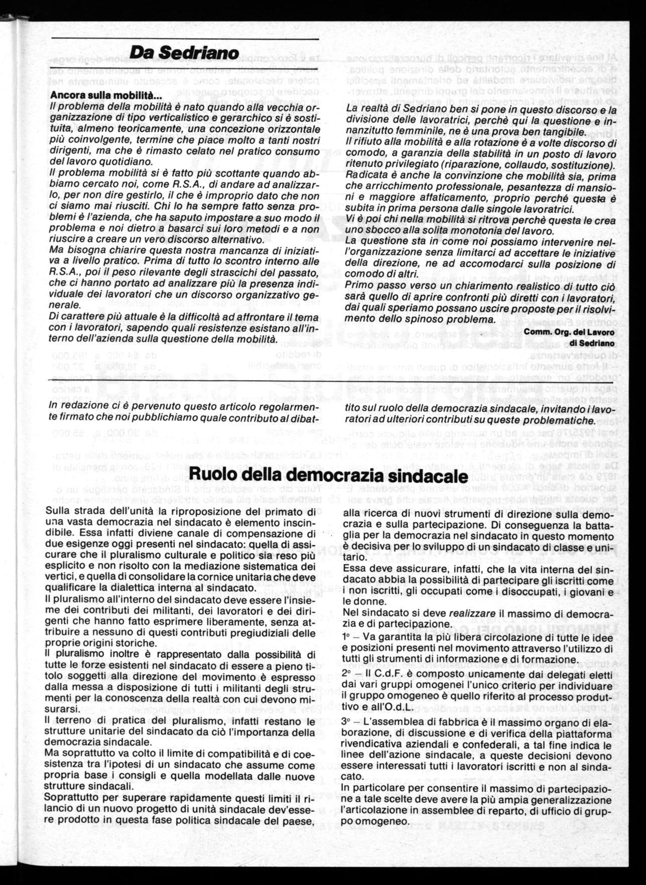 Il problema mobilità si è fatto più scottante quando abbiamo cercato noi, come R.S.A., di andare ad analizzarlo, per non dire gestirlo, il che è improprio dato che non ci siamo mai riusciti. Chi lo ha sempre fatto senza problemi è l'azienda, che ha saputo impostare a suo modo il problema e noi dietro a basarci sui loro metodi e a non riuscire a creare un vero discorso alternativo. Ma bisogna chiarire questa nostra mancanza di iniziativa a livello pratico. Prima di tutto lo scontro interno alle R.S.A., poi il peso rilevante degli strascichi del passato, che ci hanno portato ad analizzare più la presenza individuale dei lavoratori che un discorso organizzativo generale.