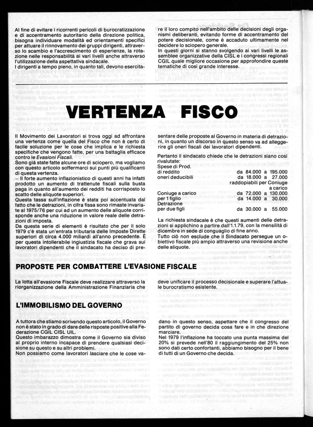 Da questa serie di elementi è risultato che per il solo 1979 c'è stata un'entrata tributaria delle Imposte Dirette superiori di circa 4.000 miliardi all'anno precedente. È per questa intollerabile ingiustizia fiscale che grava sui lavoratori dipendenti che il sindacato ha deciso di pre-