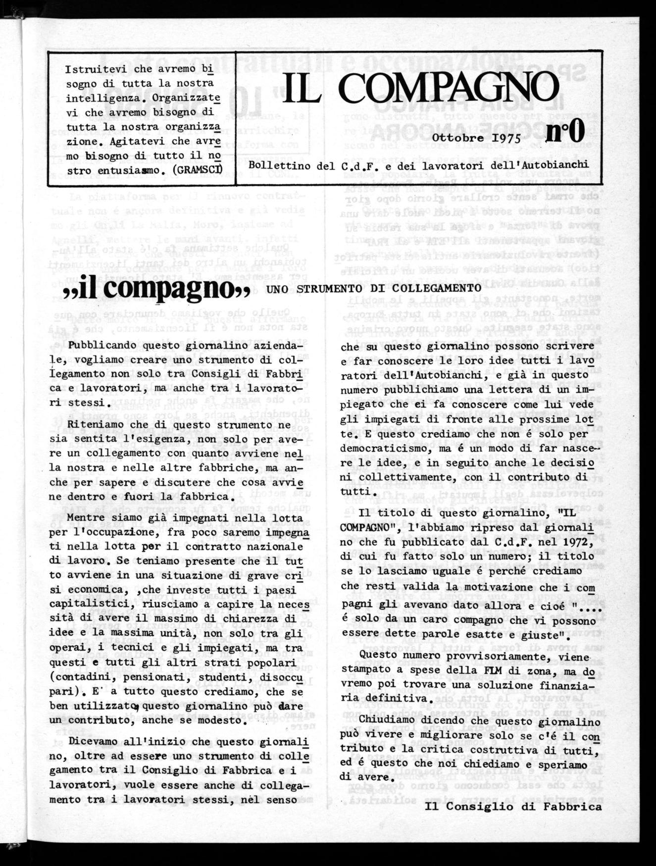 Il titolo di questo giornalino, "IL COMPAGNO", l'abbiamo ripreso dal giornali no che fu pubblicato dal C.d.F. nel 1972, di cui fu fatto solo un numero; il titolo se lo lasciamo uguale é perché crediamo che resti valida la motivazione che i com pagni gli avevano dato allora e cioé ".... é solo da un caro compagno che vi possono essere dette parole esatte e giuste".