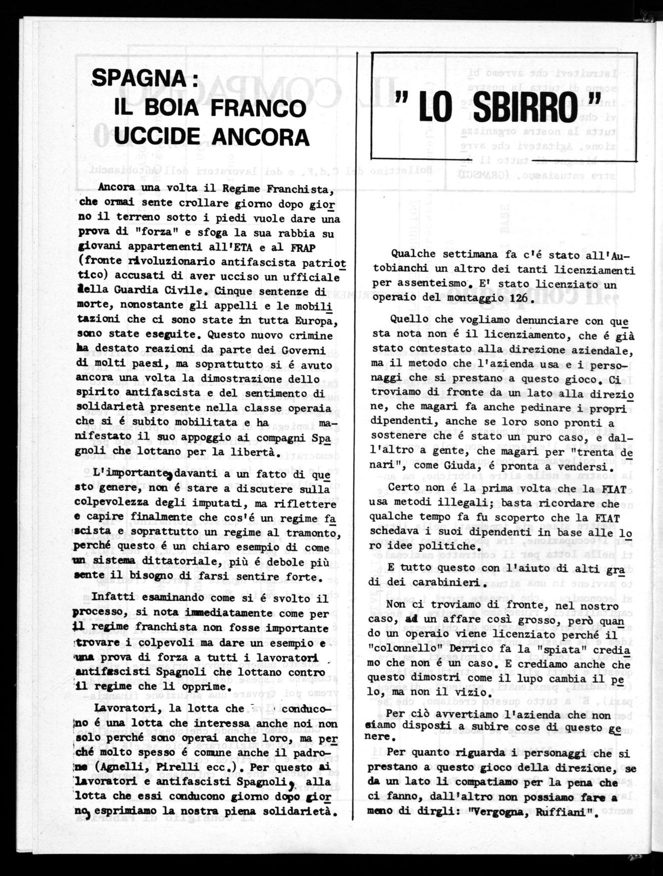 Lavoratori, la lotta che - conducono é una lotta che interessa anche noi non solo perché sono operai anche loro, ma per ,ché molto spesso é comune anche il padrone (Agnelli, Pirelli ecc.). Per questo ai lavoratori e antifascisti Spagnoli' alla lotta che essi conducono giorno dopo gior nojesprimiamo la nostra piena solidarietà.