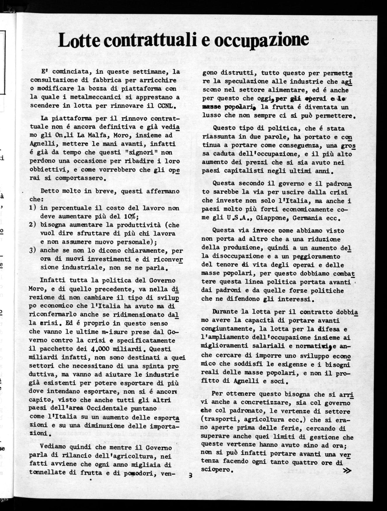 Infatti tutta la politica del Governo Moro, e di quello precedente, va nella di rezione di non cambiare il tipo di svilu2 po economico che l'Italia ha avuto ma di riconfermarlo anche se ridimensionato dal la crisi. Ed é proprio in questo senso che vanno le ultime m-isure prese dal Governo contro la crisi e specificatamente il pacchetto dei 4.000 miliardi. Questi miliardi infatti, non sono destinati a quei settori che necessitano di una spinta pro duttiva, ma vanno ad aiutare le industrie già esistenti per potere esportare di più dove intendano esportare, non si é ancora capito, visto che anche tutti gli altri paesi dell'area Occidentale puntano come l'Italia su un aumento delle esporta zioni e su una diminuzione delle importazioni.