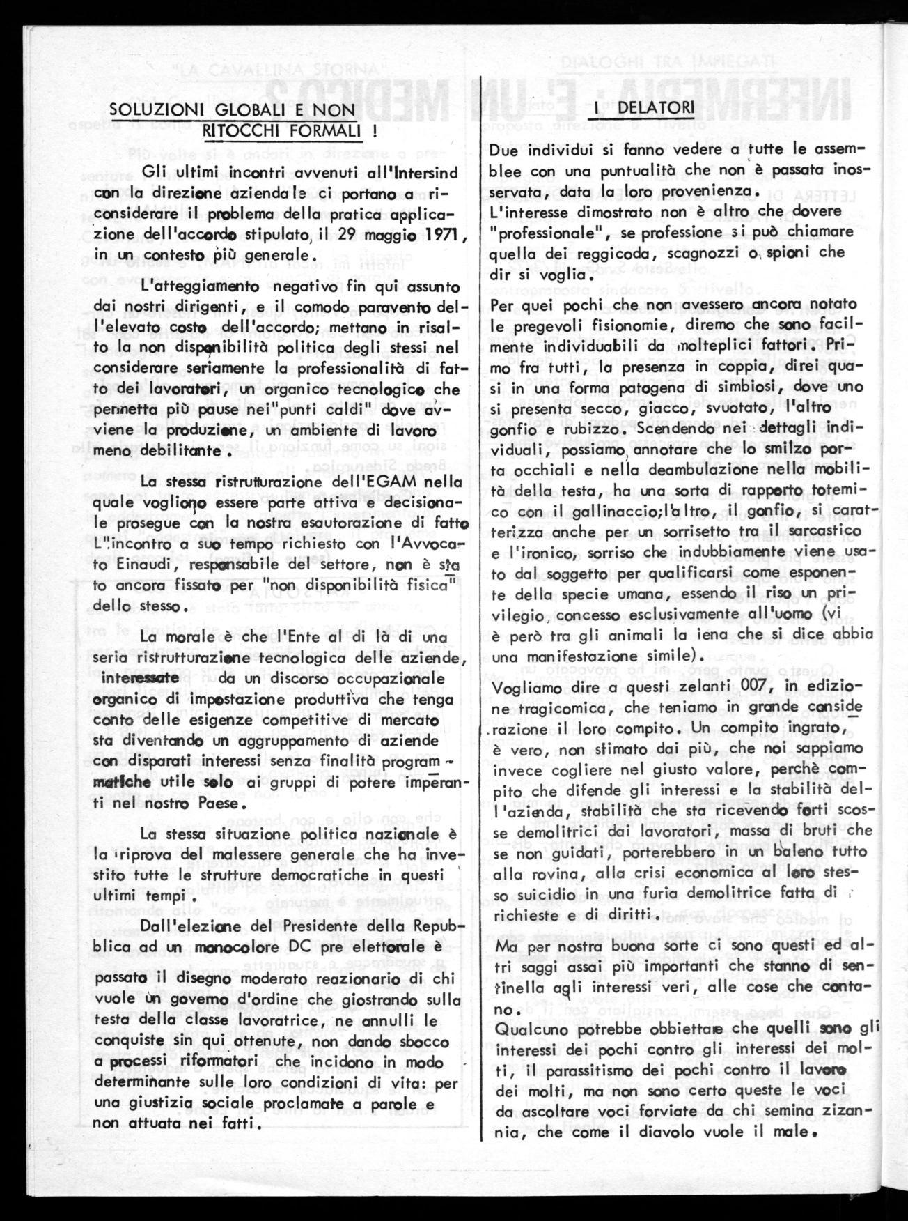 Vogliamo dire a questi zelanti 007, in edizione tragicomica, che teniamo in grande conside .razione il loro compito. Un compito ingrato, è vero, non sfimato dai più, che noi sappiamo invece cogliere nel giusto valore, perchè compito che difende gli interessi e la stabilità del1'azienda, stabilità che sta ricevendo forti scosse demolitrici dai lavoratori, massa di bruti che se non guidati, porterebbero in un baleno tutto alla rovina, alla crisi economica al loro stesso suicidio in una furia demolitrice fatta di richieste e di diritti.