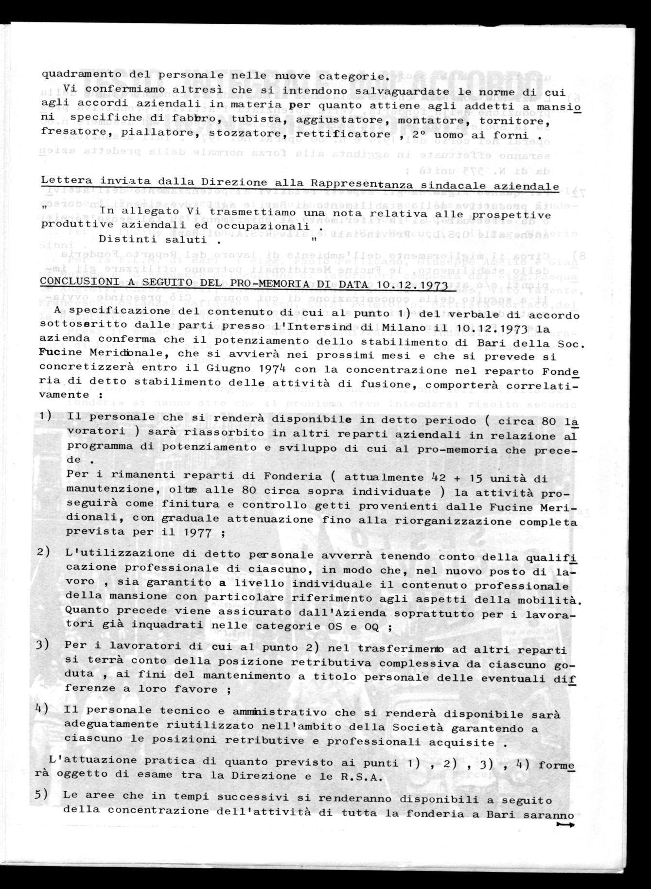 A specificazione del contenuto di cui al punto 1) del verbale di accordo sottoscritto dalle parti presso l'Intersind di Milano il 10.12.1973 la azienda conferma che il potenziamento dello stabilimento di Bari della Soc. Fucine Meridionale, che si avvierà nei prossimi mesi e che si prevede si concretizzerà entro il Giugno 1974 con la concentrazione nel reparto Fonde ria di detto stabilimento delle attività di fusione, comporterà correlativamente