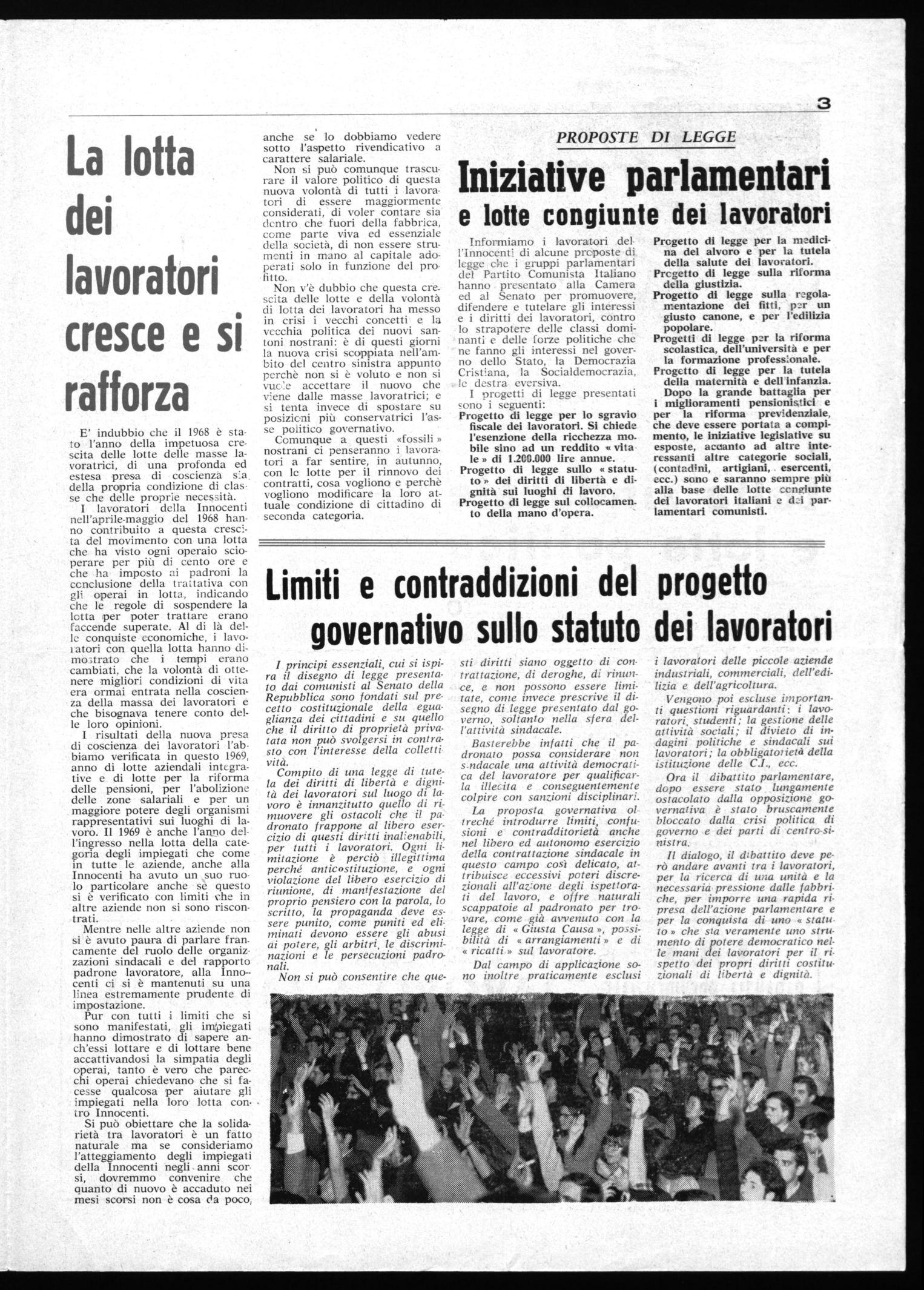 I risultati della nuova presa di coscienza dei lavoratori l'abbiamo verificata in questo 1969, anno di lotte aziendali integrative e di lotte per la riforma delle pensioni, per l'abolizione delle zone salariali e per un maggiore potere degli organismi rappresentativi sui luoghi di lavoro. Il 1969 è anche Vango dell'ingresso nella lotta della categoria degli impiegati che come in tutte le aziende, anche alla Innocenti ha avuto un „suo ruolo particolare anche se questo si è verificato con limiti che in altre aziende non si sono riscontrati.