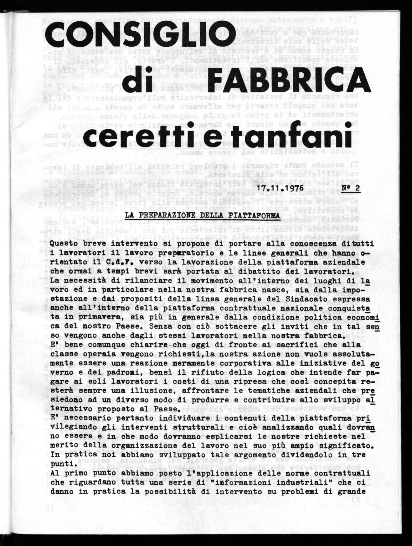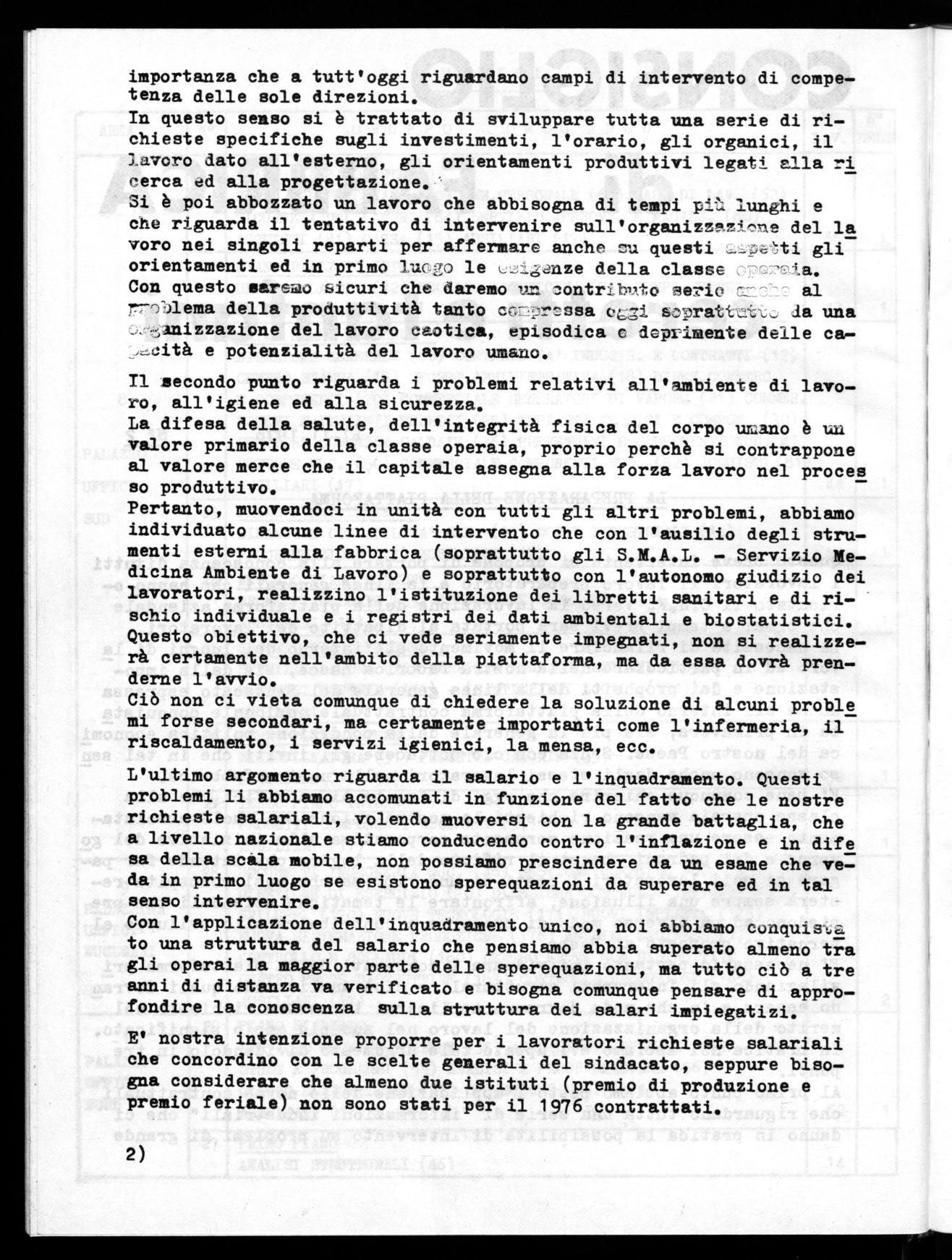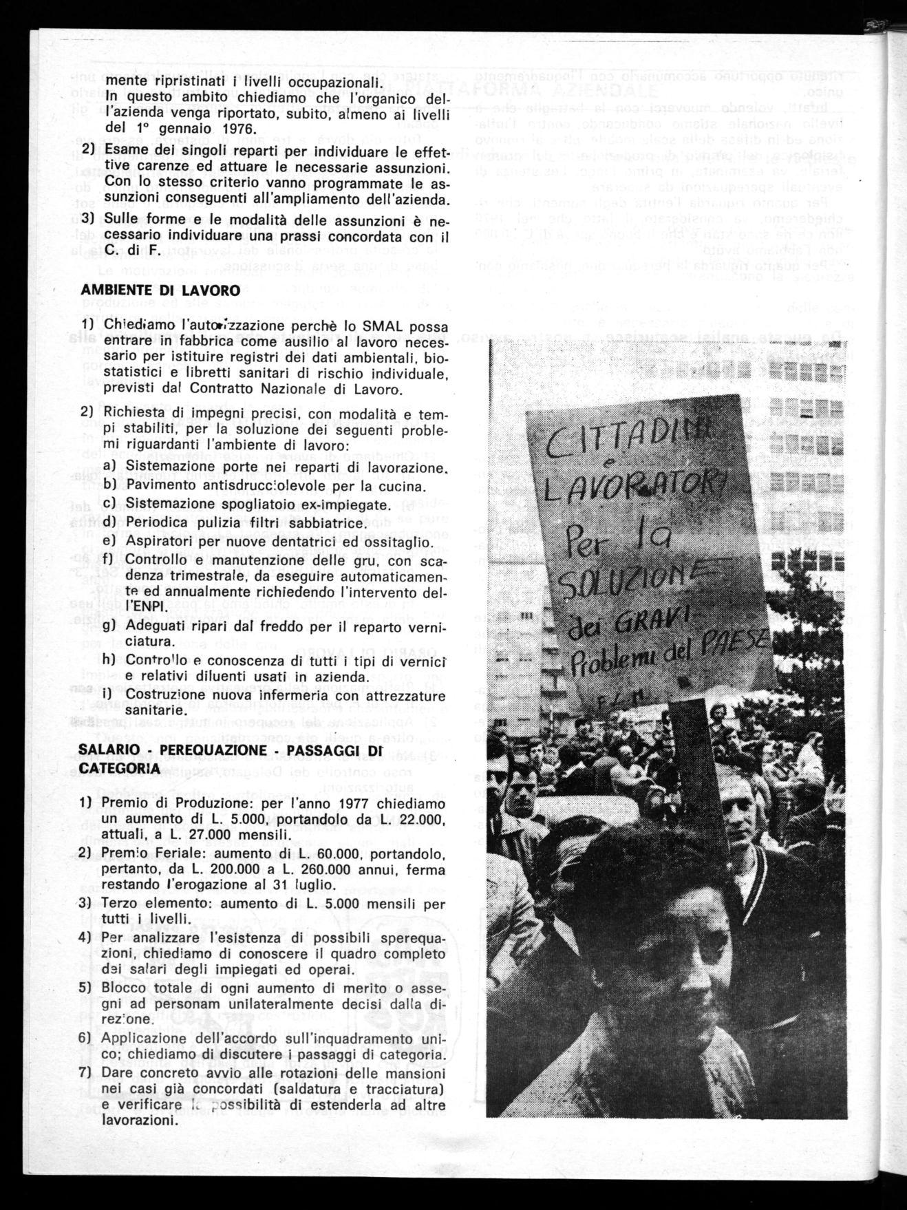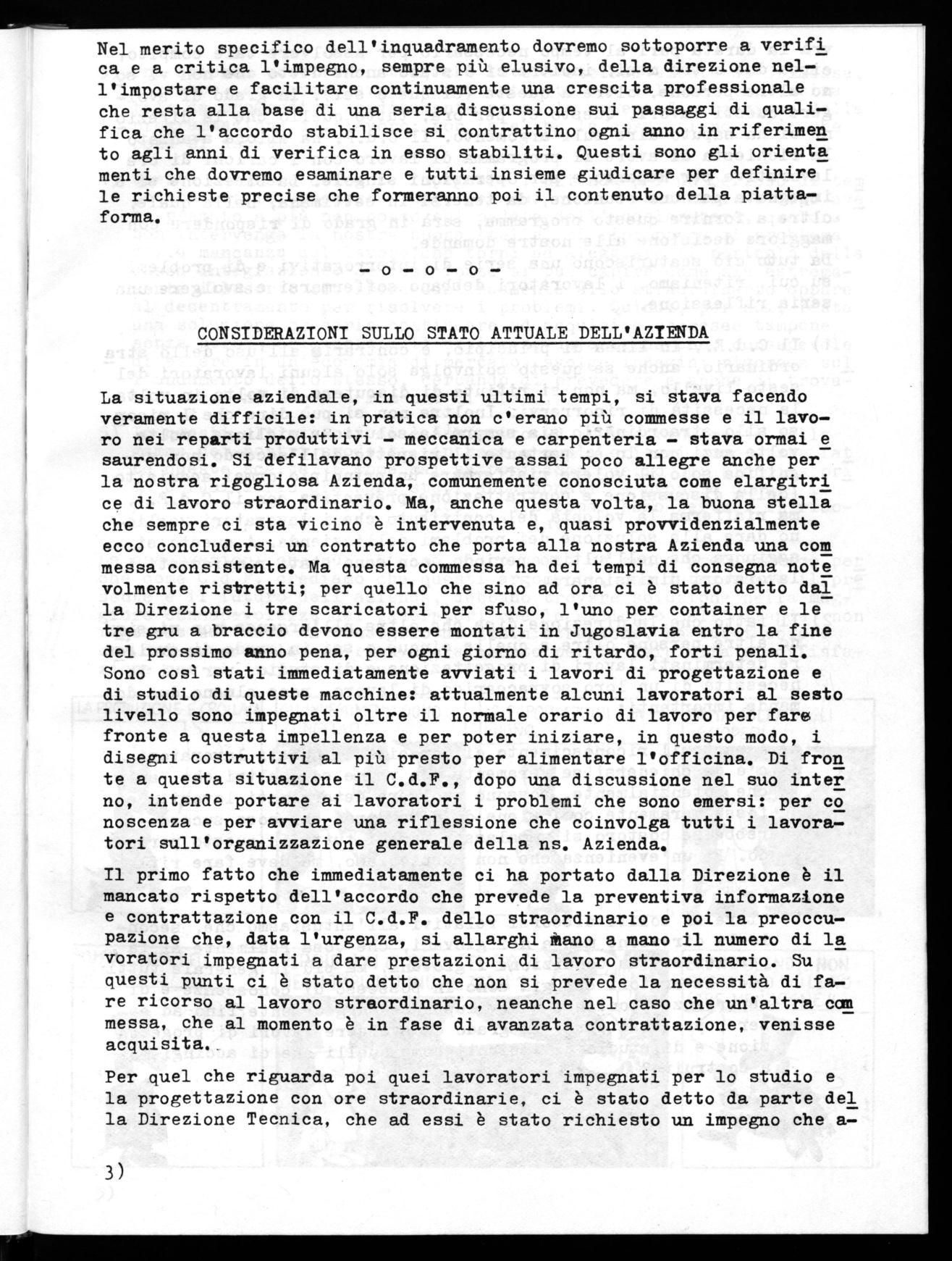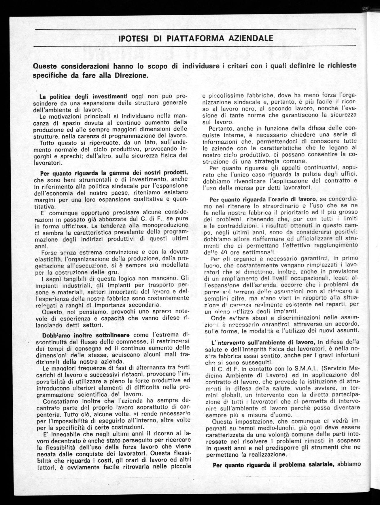 La necessità di rilanciare il movimento all'interno dei luoghi di la voro ed in particolare nella nostra fabbrica nasce, sia dalla impostazione e dai propositi della linea generale del Sindacato espressa anche all'interno della piattaforma contrattuale nazionale conquista ta in primavera, sia più in generale dalla condizione politica economi ca del nostro Paese. Senza con ciò sottacere gli inviti che in tal sen so vengono anche dagli stessi lavoratori nella nostra fabbrica.