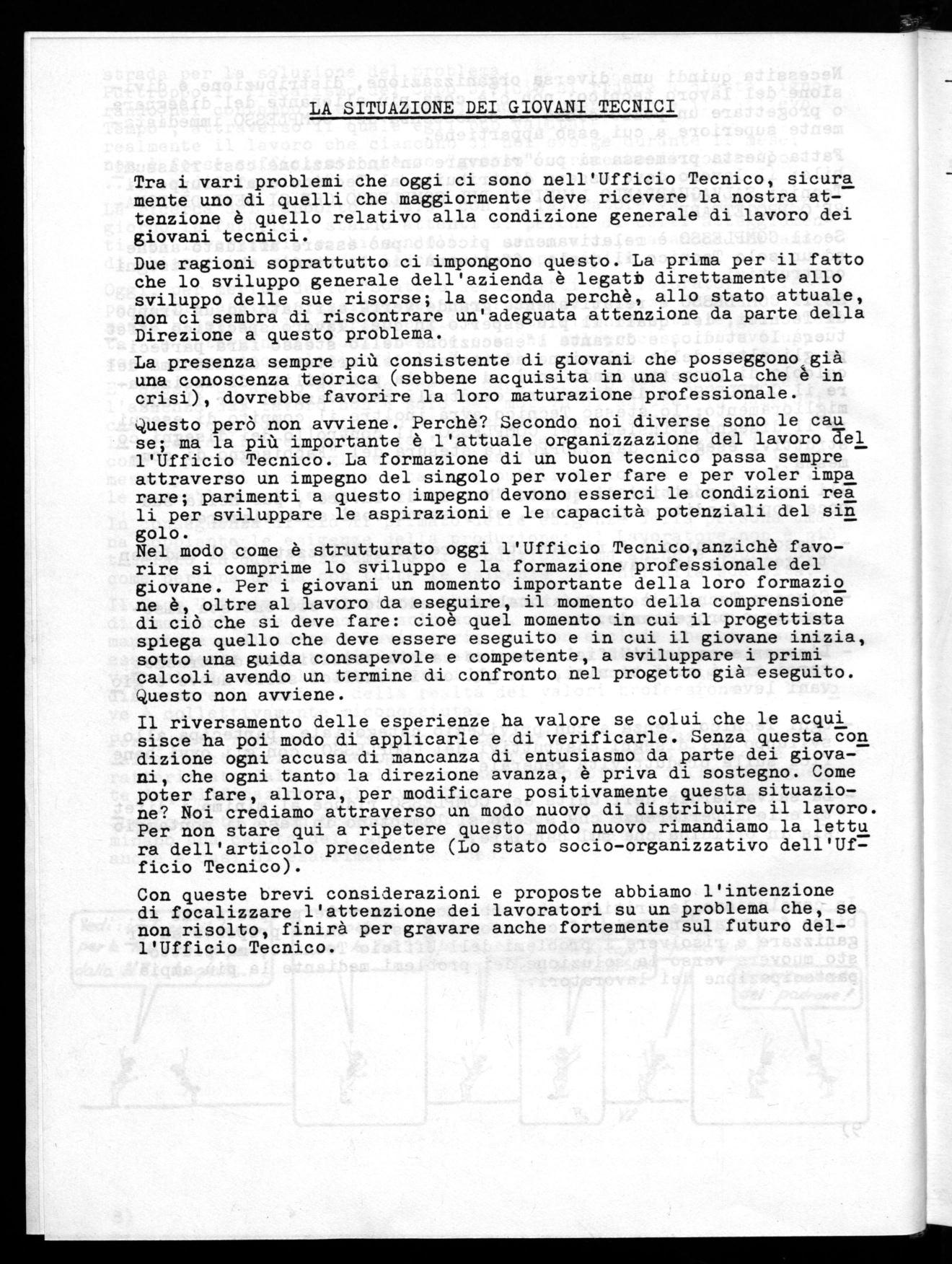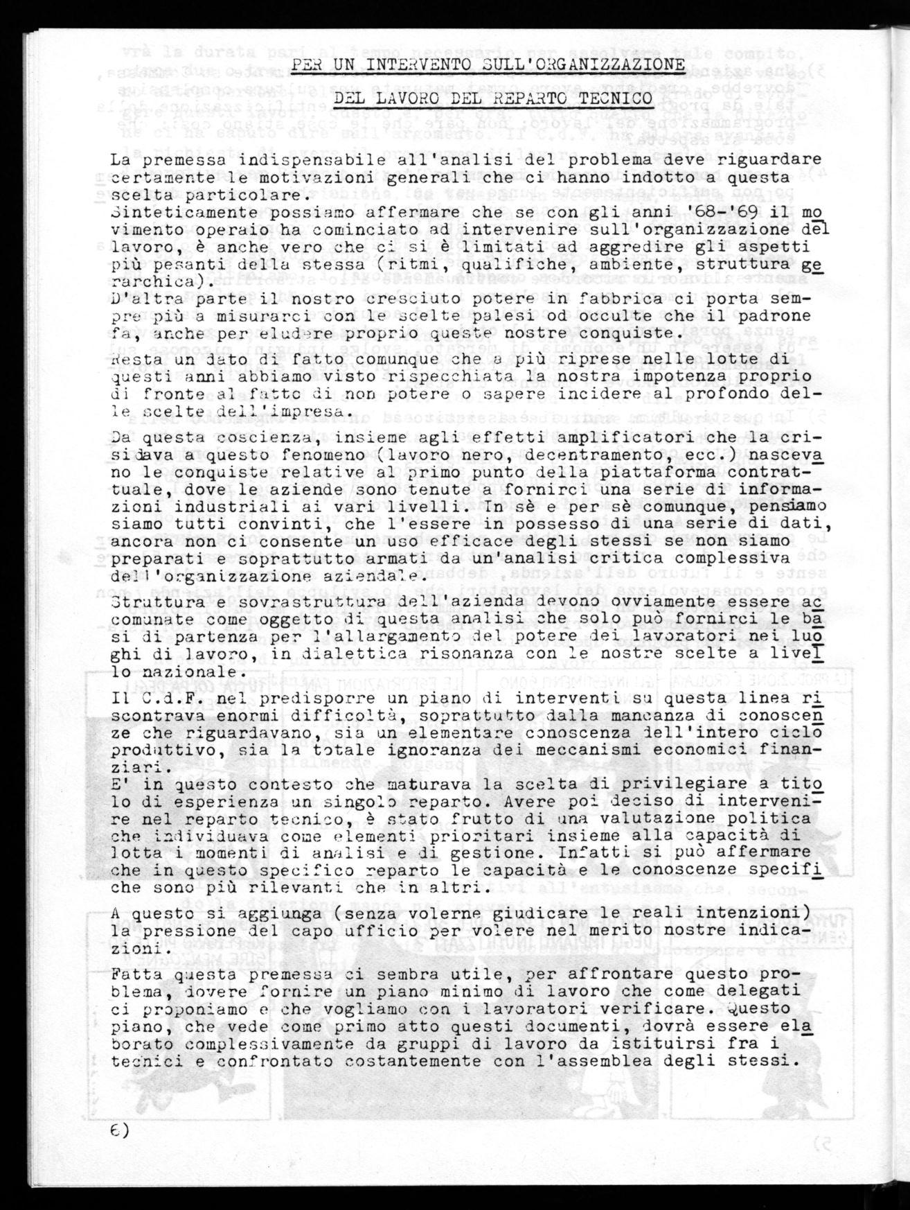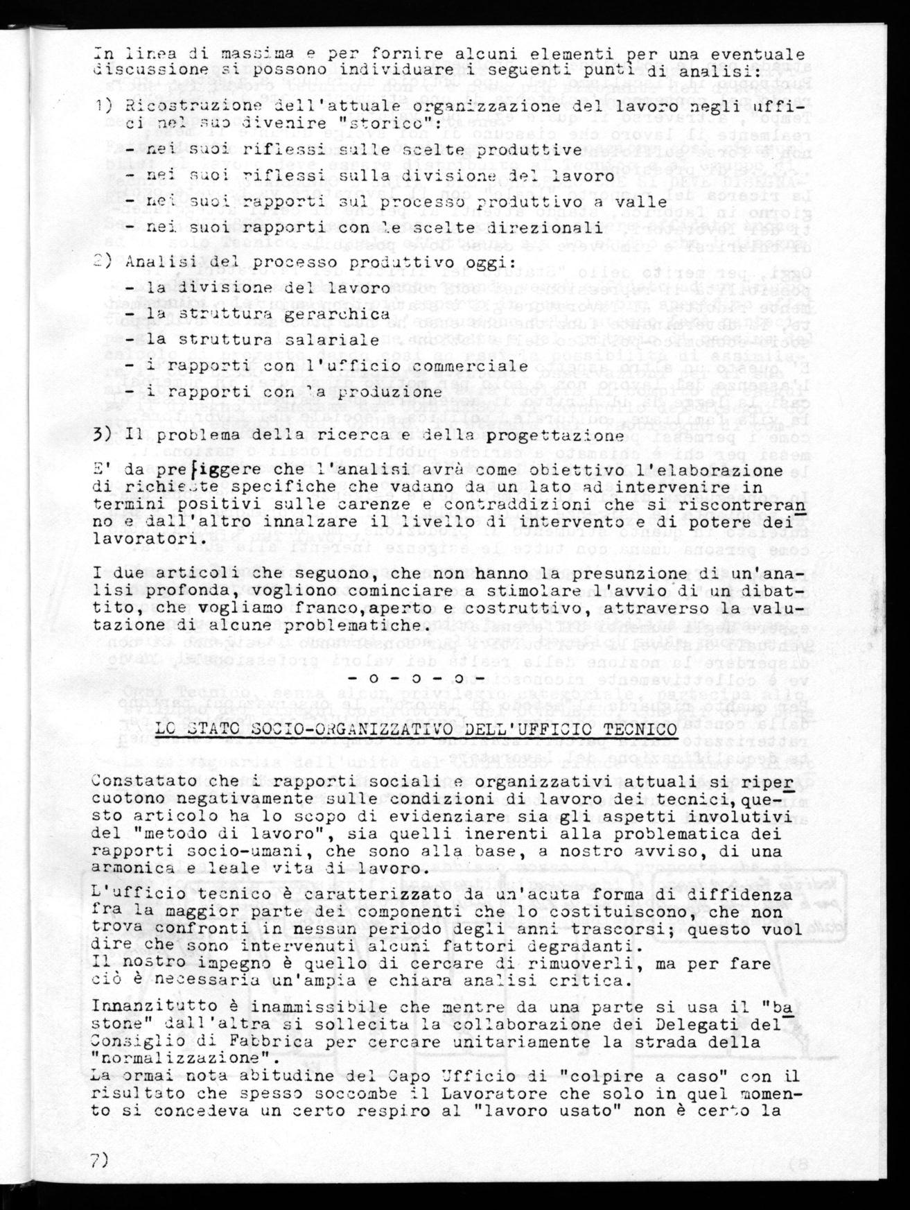 Fatta questa premessa ci sembra utile, per affrontare questo problema, dovere fornire un piano minimo di lavoro che come delegati ci proponiamo e che vogliamo con i lavoratori verificare. questo piano, che vede come primo atto questi documenti, dovrà essere ela borato complessivamente da gruppi di lavoro da istituirsi fra i tee.nici e confrontato costantemente con l'assemblea degli stessi.