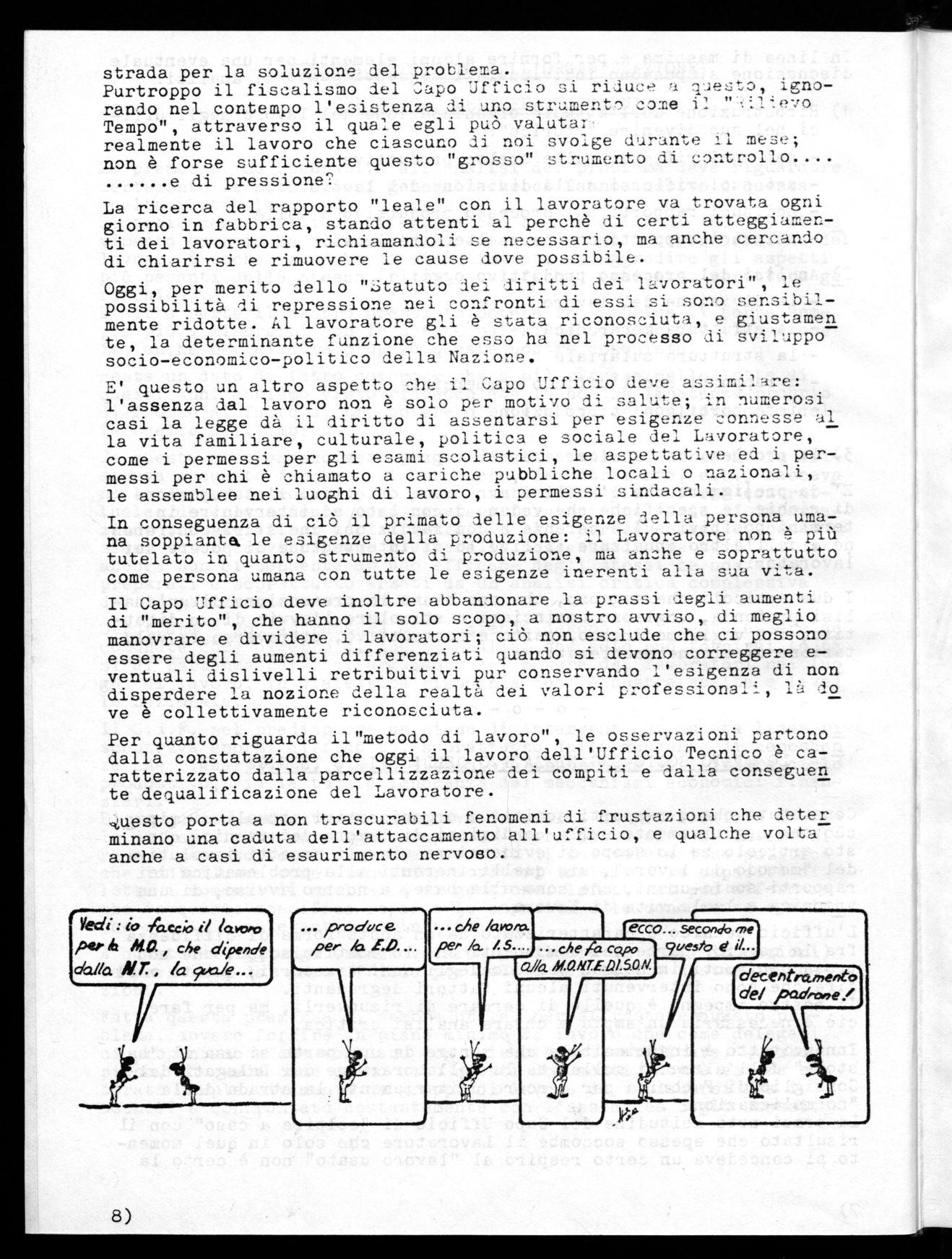 Si è poi abbozzato un lavoro che abbisogna di tempi p±'J. lunghi e che riguarda il tentativo di intervenire sull'organizz5.ziene del la voro nei singoli reparti per affermare anche cu questi gli orientamenti ed in primo lucgo le L__genze della classe C7Q793a. Con questo earswu sicuri che daremo un zontribmto gerie n7--- al 77-)"91ema della produttività tanto ccEl3ressa eLgi szTprattutt la una ..tnizzazione del lavoro ce.otica, episodica e deprimente delle ca— cità e potenzialità del lavoro umano.