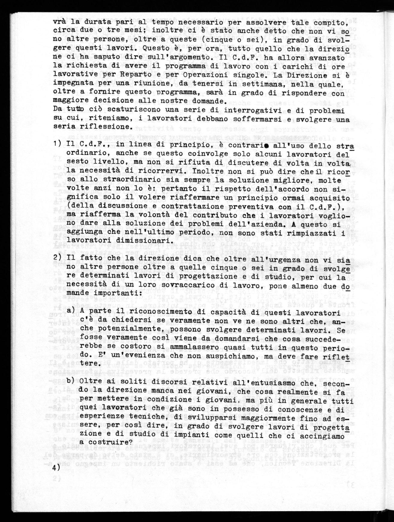 vrà la durata pari al tempo necessario per assolvere tale compito, circa due o tre mesi; inoltre ci è stato anche detto che non vi so no altre persone, oltre a queste (cinque o sei), in grado di svol— gere questi lavori. Questo è, per ora, tutto quello che la direzio ne ci ha saputo dire sull'argomento. Il C.d.F. ha allora avanzato la richiesta di avere il programma di lavoro con i carichi di ore lavorative per Reparto e per Operazioni singole. La Direzione si è impegnata per una riunione, da tenersi in settimana, nella quale, oltre a fornire questo programma, sarà in grado di rispondere con maggiore decisione alle nostre domande. Da tutto ciò scaturiscono una serie di interrogativi e di problemi su cui, riteniamo, i lavoratori debbano soffermarsi e svolgere una seria riflessione.