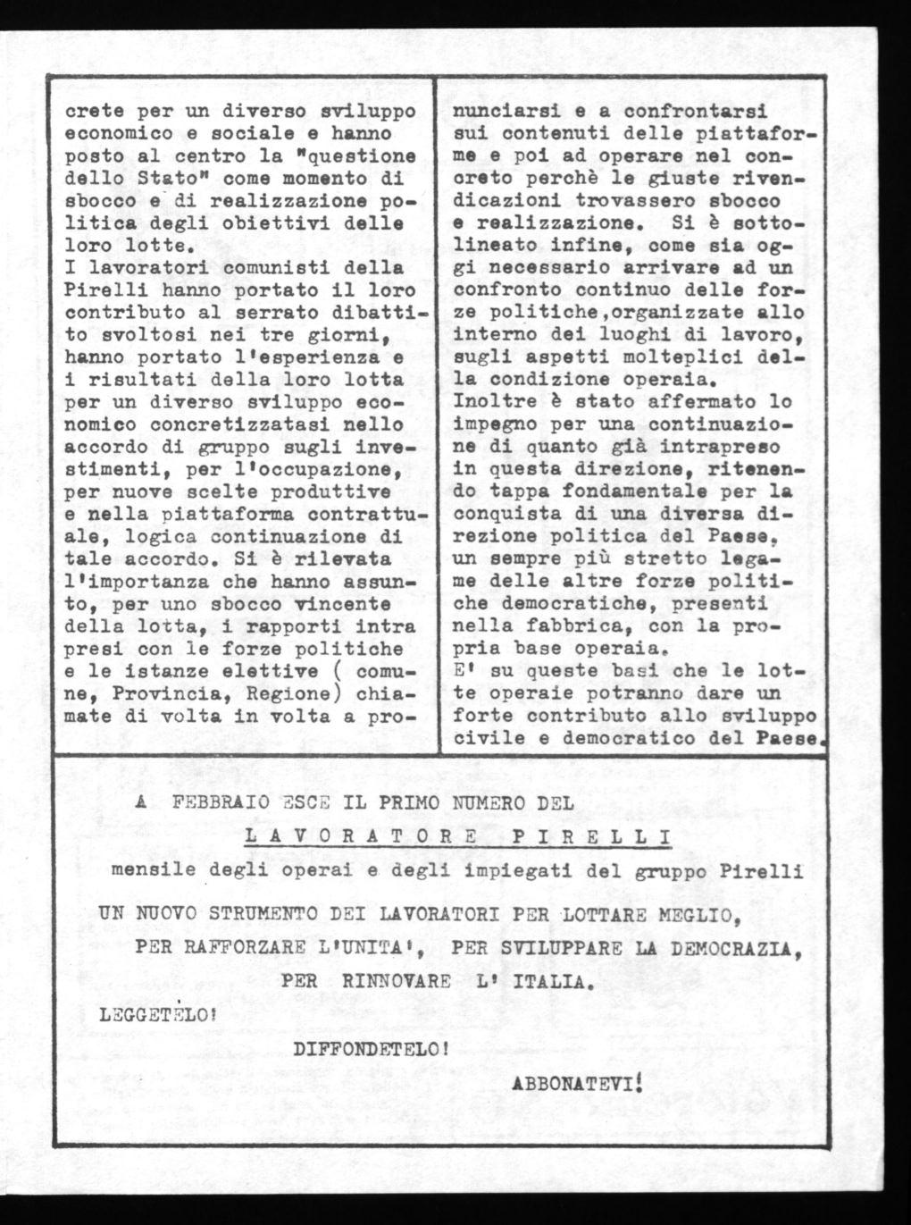 I lavoratori comunisti della Pirelli hanno portato il loro contributo al serrato dibattito svoltosi nei tre giorni, hanno portato l'esperienza e i risultati della loro lotta per un diverso sviluppo economico concretizzatasi nello accordo di gruppo sugli investimenti, per l'occupazione, per nuove scelte produttive