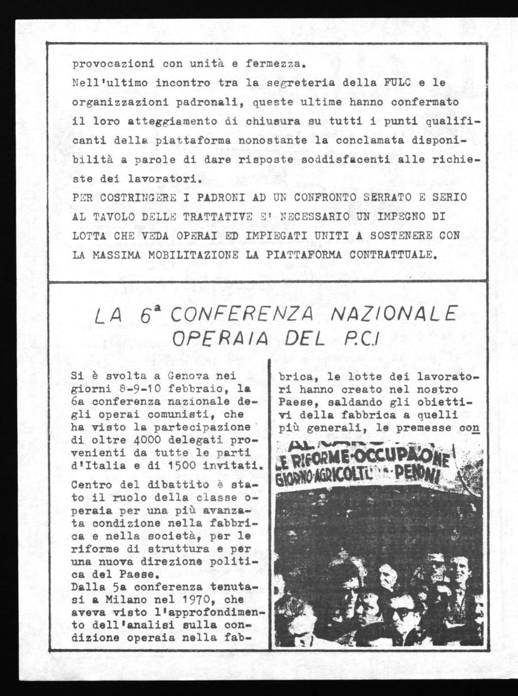 nunciarsi e a confrontarsi sui contenuti delle piattaforme e poi ad operare nel conoreto perchè le giuste rivendicazioni trovassero sbocco e realizzazione. Si è sottolineato infine, come sia oggi necessario arrivare ad un confronto continuo delle forze politiche,organizzate allo interno dei luoghi di lavoro, sugli aspetti molteplici della condizione operaia. Inoltre è stato affermato lo impegno per una continuazione di quanto già intrapreso in questa direzione, ritenendo tappa fondamentale per la conquista di una diversa direzione politica del Paese, un sempre più stretto legame delle altre forze politiche democratiche, presenti nella fabbrica, con la propria base operaia.