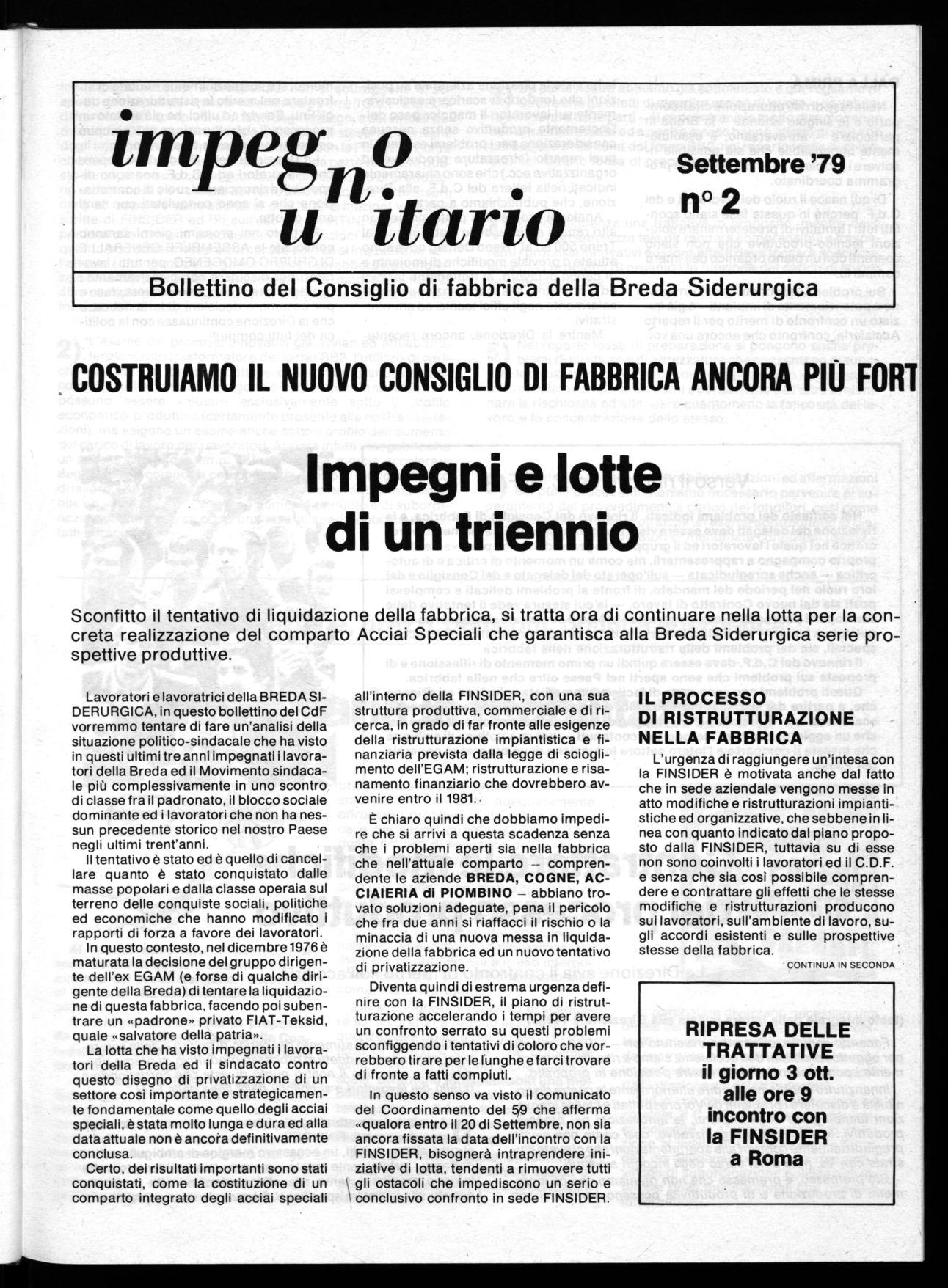 Lavoratori e lavoratrici della BREDA SIDERURGICA, in questo bollettino del CdF vorremmo tentare di fare un'analisi della situazione politico-sindacale che ha visto in questi ultimi tre anni impegnati i lavoratori della Breda ed il Movimento sindacale più complessivamente in uno scontro di classe fra il padronato, il blocco sociale dominante ed i lavoratori che non ha nessun precedente storico nel nostro Paese negli ultimi trent'anni.