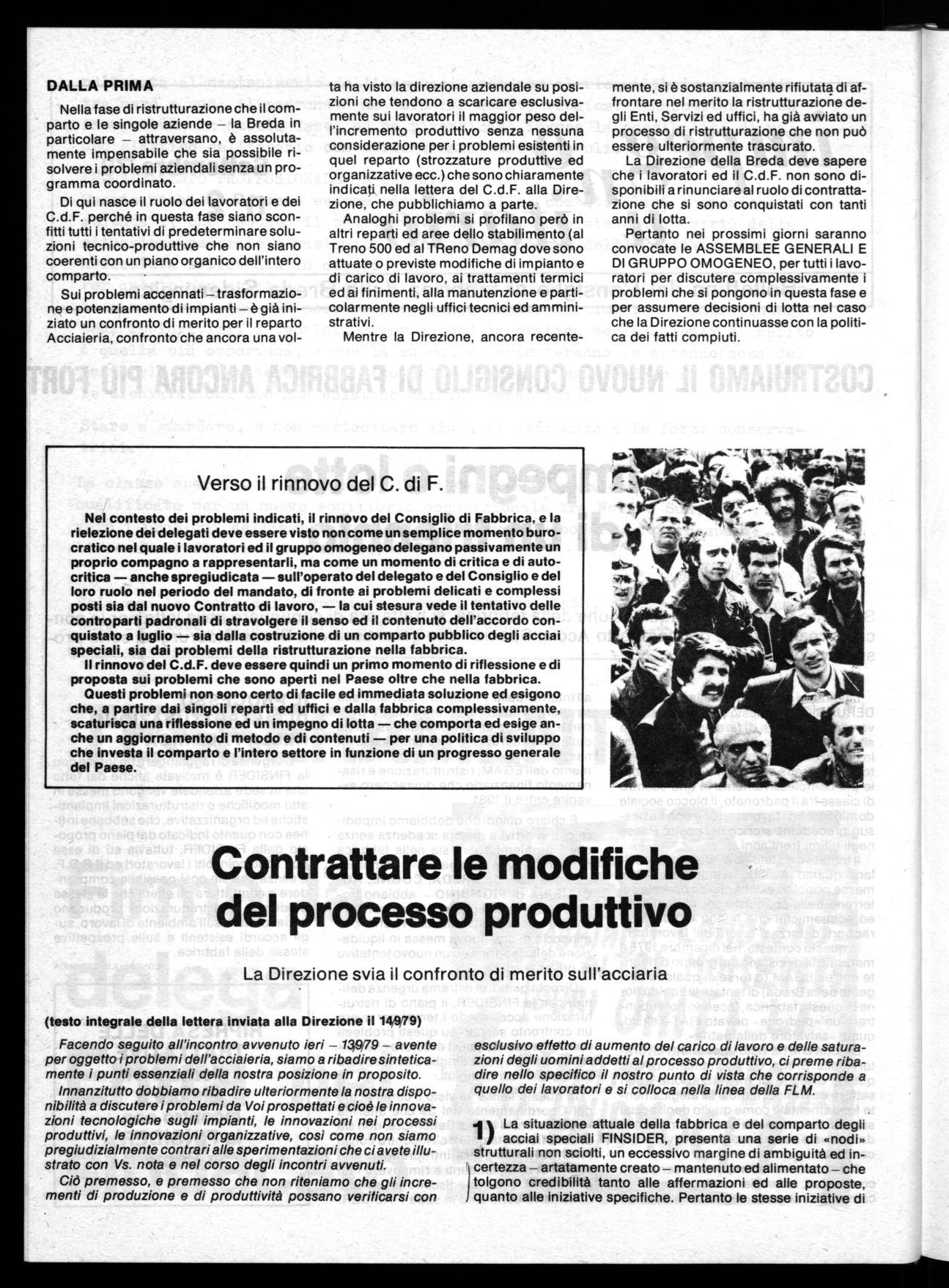 Nel contesto dei problemi indicati, il rinnovo del Consiglio di Fabbrica, e la rielezione dei delegati deve essere visto non come un semplice momento burocratico nel quale i lavoratori ed il gruppo omogeneo delegano passivamente un proprio compagno a rappresentarli, ma come un momento di critica e di autocritica — anche spregiudicata — sull'operato del delegato e del Consiglio e del loro ruolo nel periodo del mandato, di fronte ai problemi delicati e complessi posti sia dal nuovo Contratto di lavoro, — la cui stesura vede il tentativo delle controparti padronali di stravolgere il senso ed il contenuto dell'accordo conquistato a luglio — sia dalla costruzione di un comparto pubblico degli acciai speciali, sia dai problemi della ristrutturazione nella fabbrica.