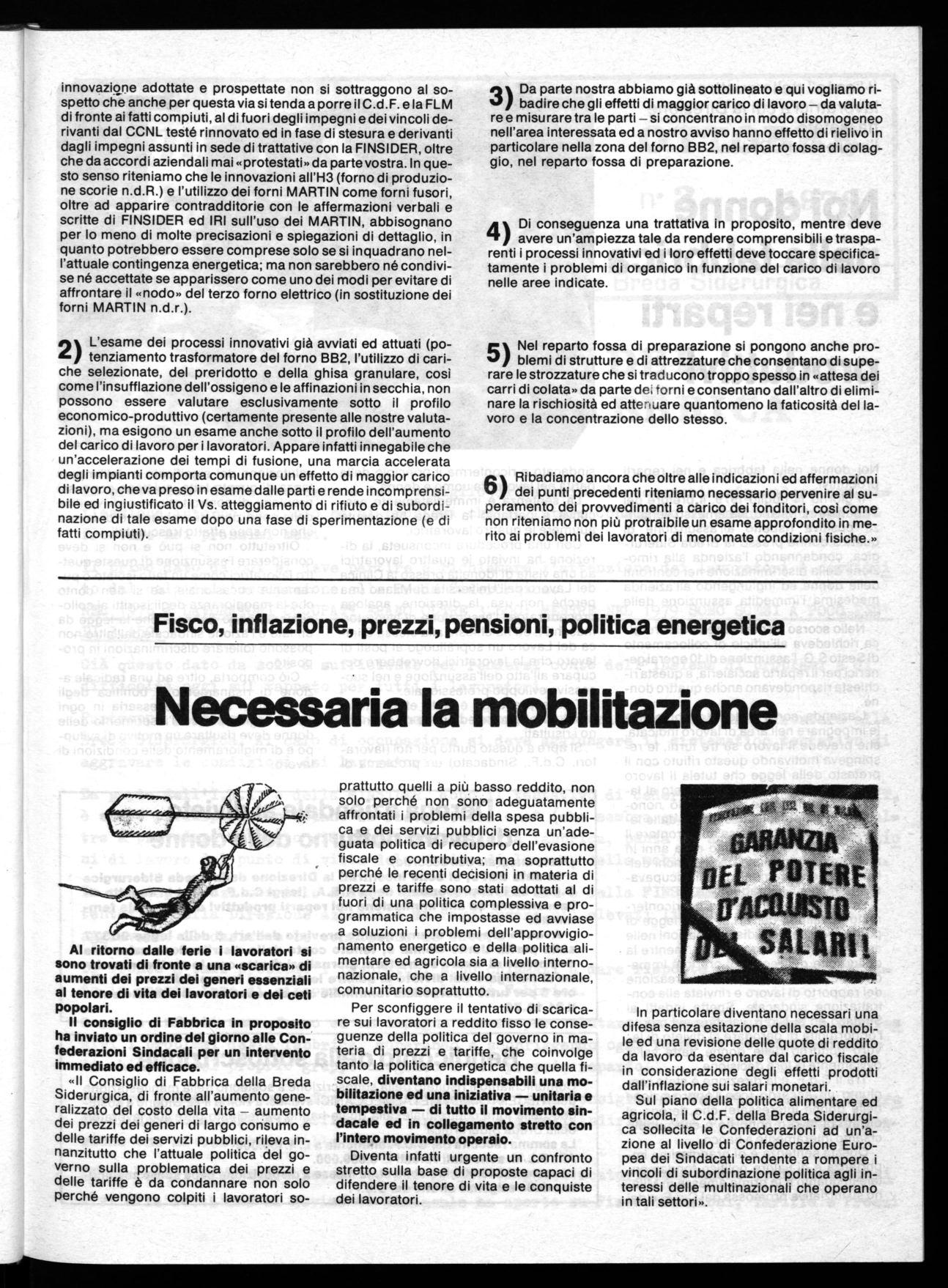 «Il Consiglio di Fabbrica della Breda Siderurgica, di fronte all'aumento generalizzato del costo della vita - aumento dei prezzi dei generi di largo consumo e delle tariffe dei servizi pubblici, rileva innanzitutto che l'attuale politica del governo sulla problematica dei prezzi e delle tariffe è da condannare non solo perché vengono colpiti i lavoratori so-