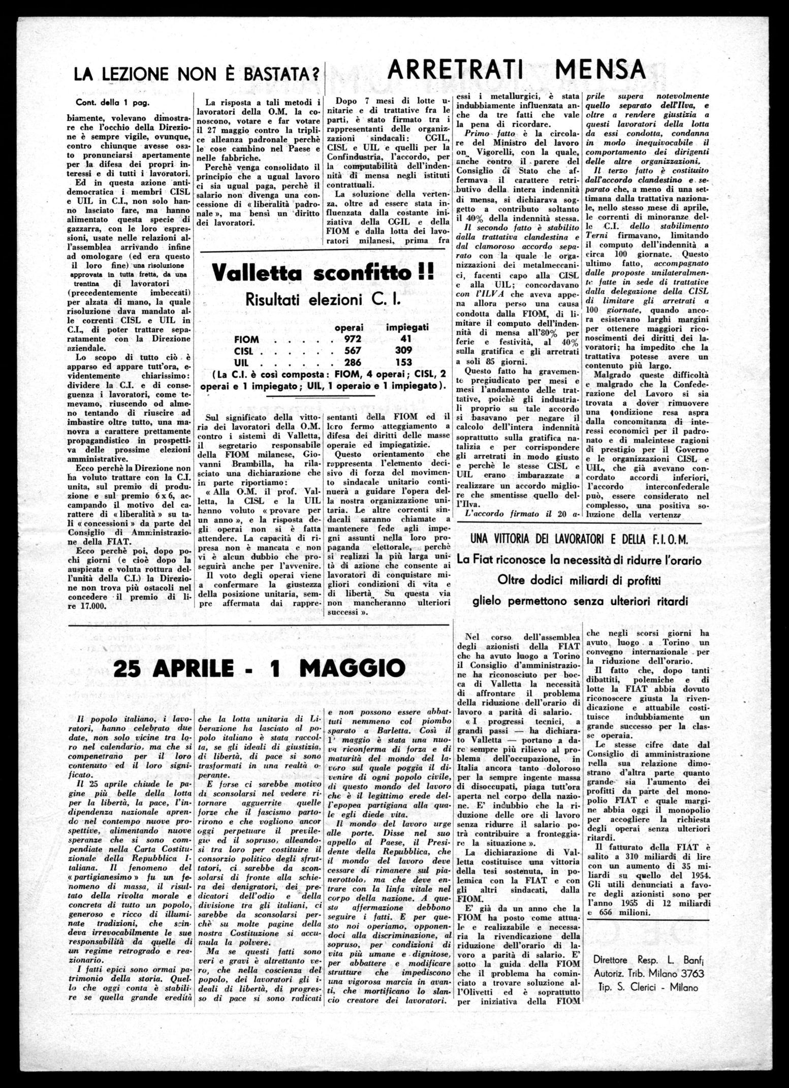 Sul significato della vittoria dei lavoratori della O.M. contro i sistemi di Valletta, il segretario responsabile della FIOM milanese, Giovanni Brambilla, ha rilasciato una dichiarazione che in parte riportiamo: