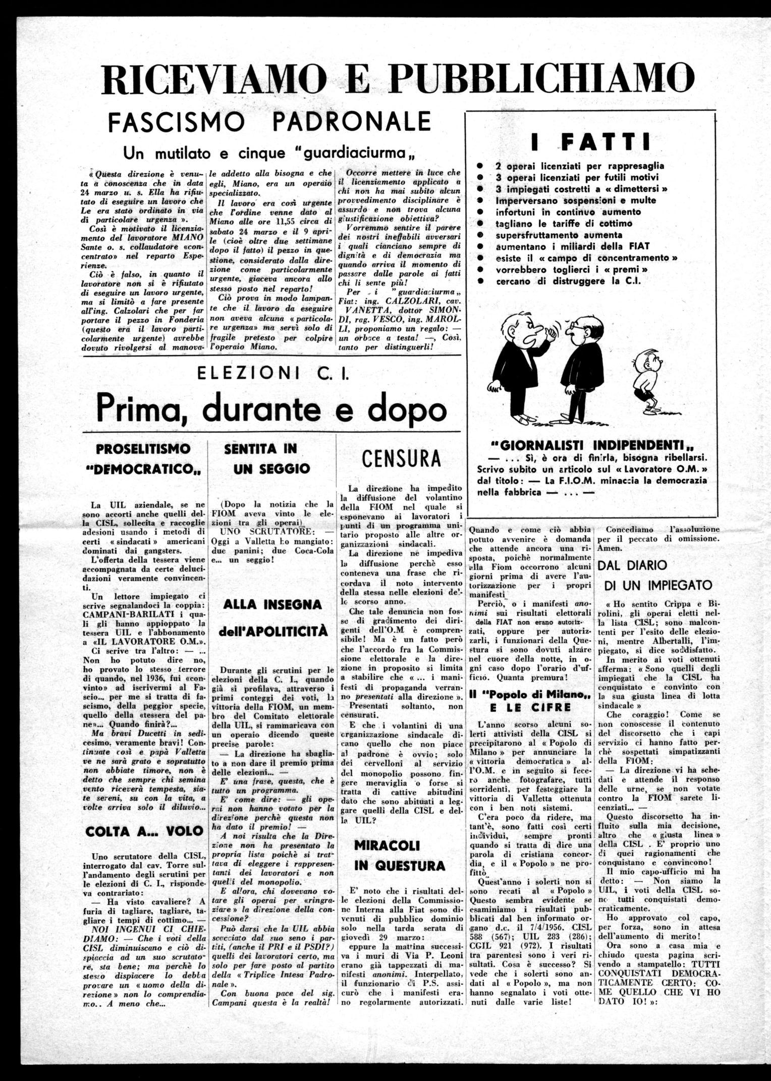 E' noto che i risultati delle elezioni della Commissione Interna alla Fiat sono divenuti di pubblico dominio solo nella tarda serata di giovedì 29 marzo: eppure la mattina successiva i muri di Via P. Leoni erano già tappezzati di manifesti anonimi. Interpellato, il funzionario di P.S. assicurò che i manifesti erano regolarmente autorizzati.