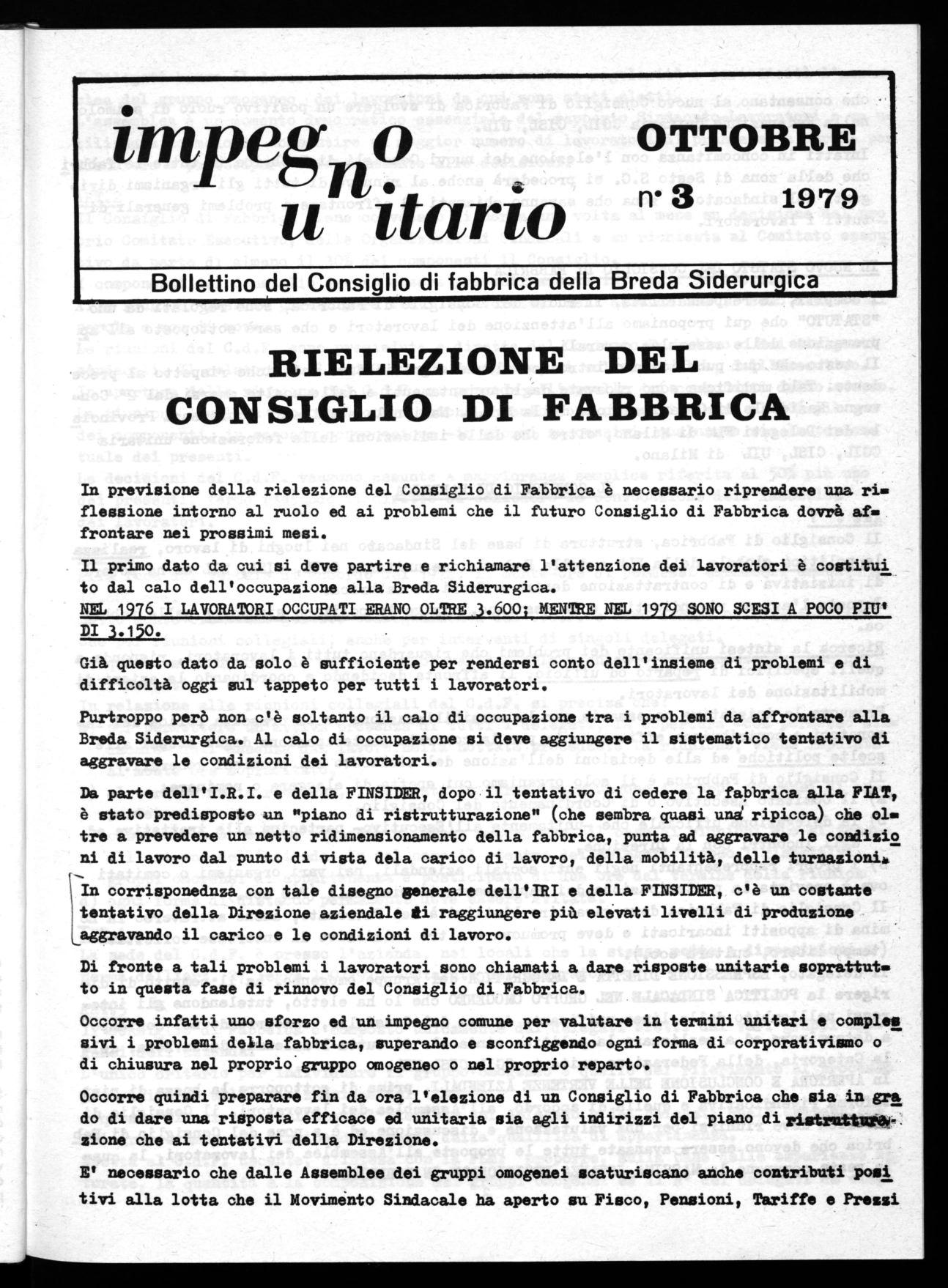 Nel contesto dei problemi indicati, il rinnovo del Consiglio di Fabbrica, e la rielezione dei delegati deve essere visto non come un semplice momento burocratico nel quale i lavoratori ed il gruppo omogeneo delegano passivamente un proprio compagno a rappresentarli, ma come un momento di critica e di autocritica — anche spregiudicata — sull'operato del delegato e del Consiglio e del loro ruolo nel periodo del mandato, di fronte ai problemi delicati e complessi posti sia dal nuovo Contratto di lavoro, — la cui stesura vede il tentativo delle contro parti padronali di stravolgere il senso ed il contenuto dell'accordo conquistato a luglio — sia dalla costruzione di un comparto pubblico degli acciai speciali, sia dai problemi della ristrutturazione nella fabbrica.