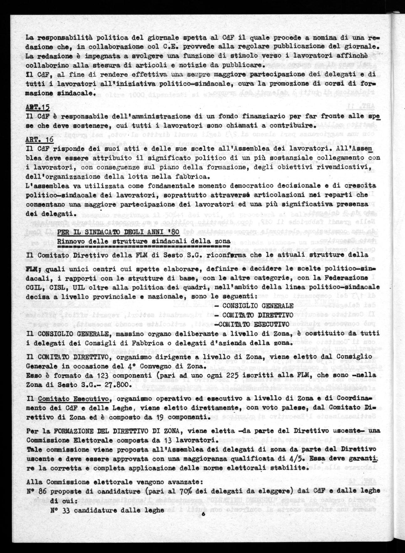 Il Comitato Direttivo della FLM di Sesto S.G. riconferma che le attuali strutture della FUI; ,quali unici centri cui spette elaborare, definire e decidere le scelte politico-sin» dacali, i rapporti con le strutture di base, con le altre categorie, con la Federazione CGIL, CISL, UIL oltre alla politica dei quadri, nell'ambito della linea politico-sindacale decisa a livello provinciale e nazionale, sono le seguenti:
