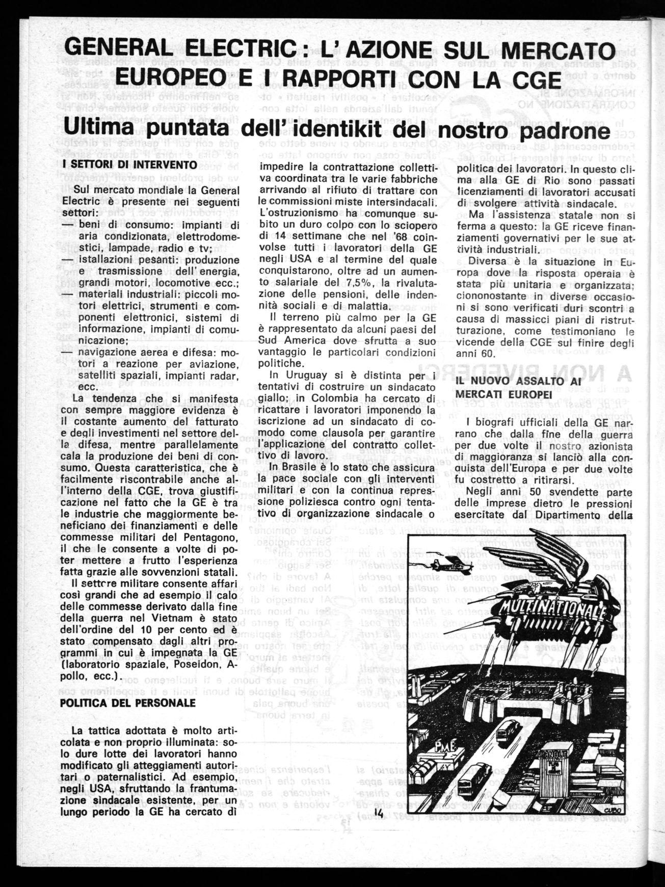 Questo tuttavia non deve significare la chiusura a riccio in difesa di presunti interessi aziendali, portando sulle proprie spalle il padrone GE perchè così il lavoro è assicurato. La drammatica esperienza che stanno vivendo migliaia di lavoratori licenziati da multinazionali straniere (GIE, MERREL, LITTON ecc.) dimostra che il problema di fondo è quello di conquistare maggiori poteri decisonali. La crisi economica internazionale è oggi il terreno di battaglia su cui si gioca la partita tra i colossi industriali — non certo in nome di un nuovo ordine teso a superare i limiti cosiddetti nazionali — ma in nome di una diversa distribuzione dei mercati che, nonostante modifiche degli equilibri esistenti, lasci inalterati i meccanismi tradizionali di funzionamento delle multinazionali, accrescendo le disuguaglianze e la subordinazione dei paesi e delle industrie più deboli. Non abbiamo accennato alla strategia internazionale dei padroni per diffondere panico e sfiducia. Certo per il movimento dei lavoratori esistono grosse difficoltà nell'affrontare oggi con successo que-