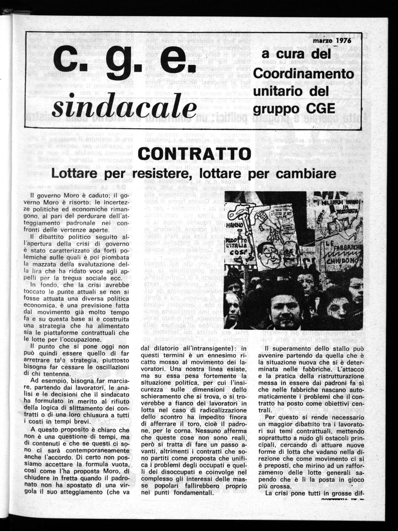 avvenuto anche sulla base di una ampia concordanza nel riconoscere nell'atteggiamento della CGE il riflesso di quello che è l'atteggiamento del padronato in generale. Non è infatti puro esercizio accademico affrontare i problemi che ci toccano direttamente in fabbrica ricercando punti di riferimento nella situazione esterna, in quanto sui temi del controllo della produzione le battaglie che oggi si devono affrontare in fabbrica si allacciano strettamente con gli obiettivi contrattuali. E' spuntata cioè coscienza del fatto che i pro-