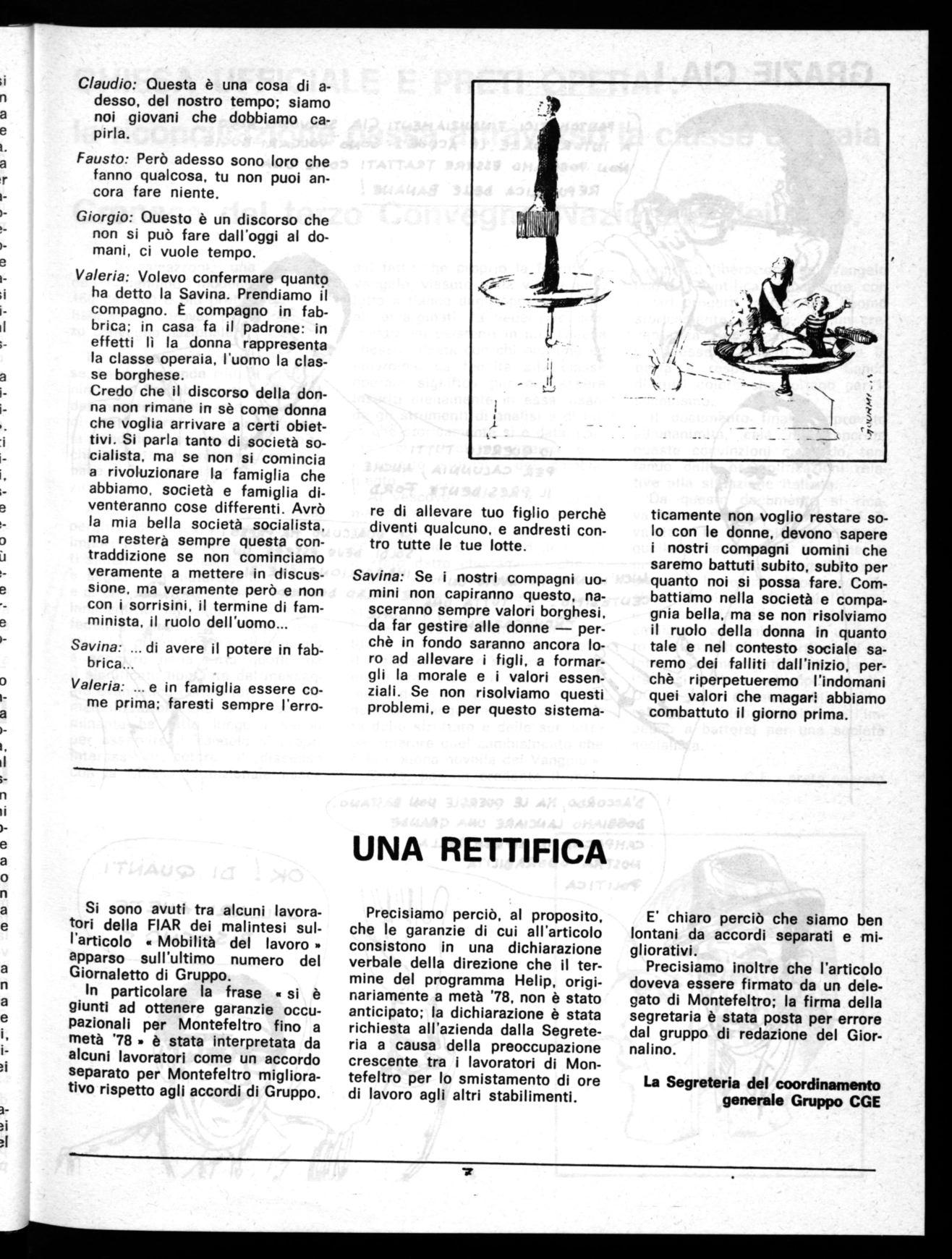 Claudio: Il discorso della Savina era chiaro; il lavare i piatti non c'entra. Qui siamo in sette, ma in fabbrica gli operai, quelli che dovrebbero essere più coscienti, invece sono i meno. Questo discorso sarebbe da portare nei reparti, a botta calda.