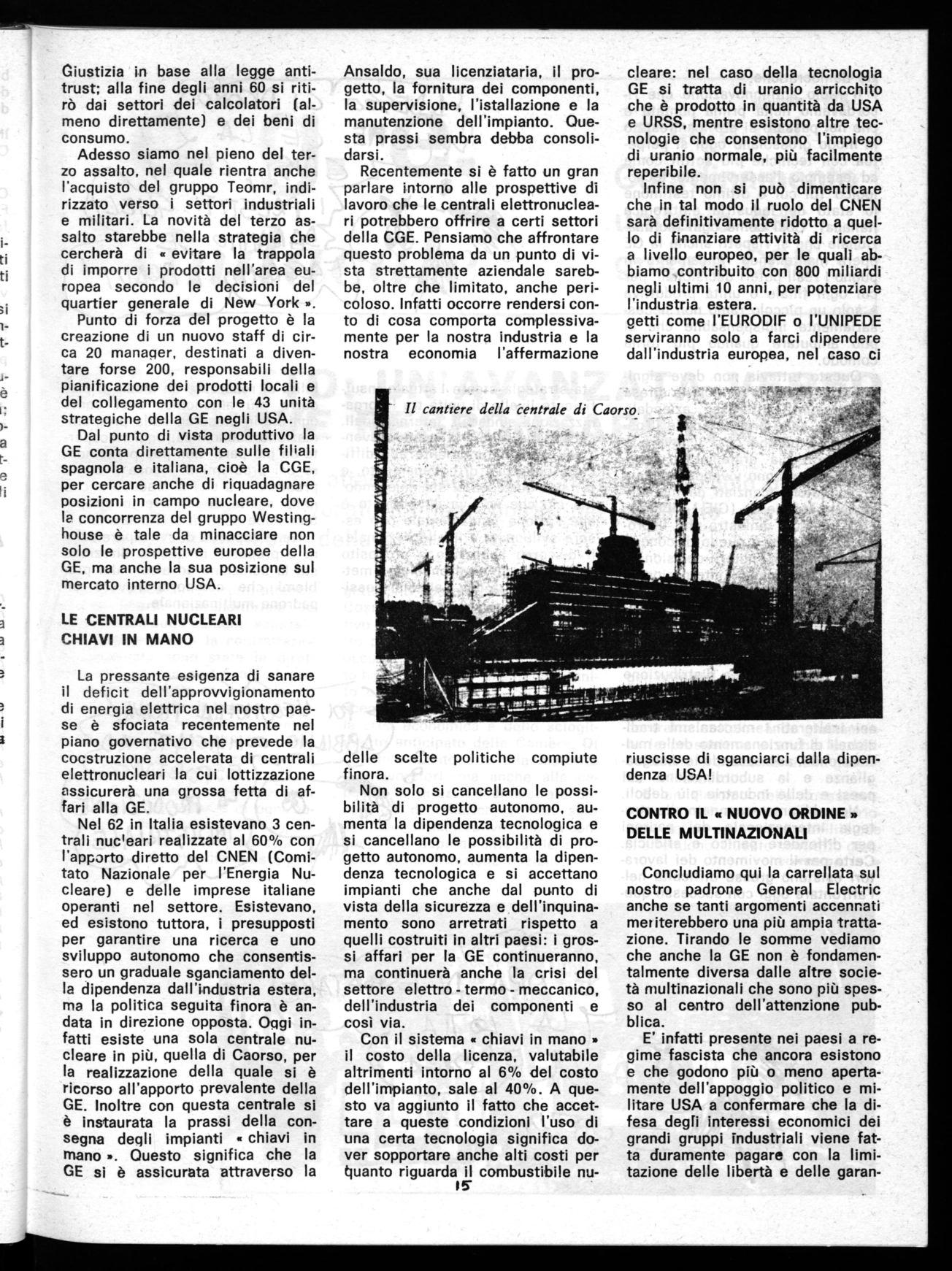 Nel 62 in Italia esistevano 3 centrali nuc'eari realizzate al 60% con l'apporto diretto del CNEN (Comitato Nazionale per l'Energia Nucleare) e delle imprese italiane operanti nel settore. Esistevano, ed esistono tuttora, i presupposti per garantire una ricerca e uno sviluppo autonomo che consentissero un graduale sganciamento della dipendenza dall'industria estera, ma la politica seguita finora è andata in direzione opposta. Oggi infatti esiste una sola centrale nucleare in più, quella di Caorso, per la realizzazione della quale si è ricorso all'apporto prevalente della GE. Inoltre con questa centrale si è instaurata la prassi della consegna degli impianti « chiavi in mano ». Questo significa che la GE sì è assicurata attraverso la