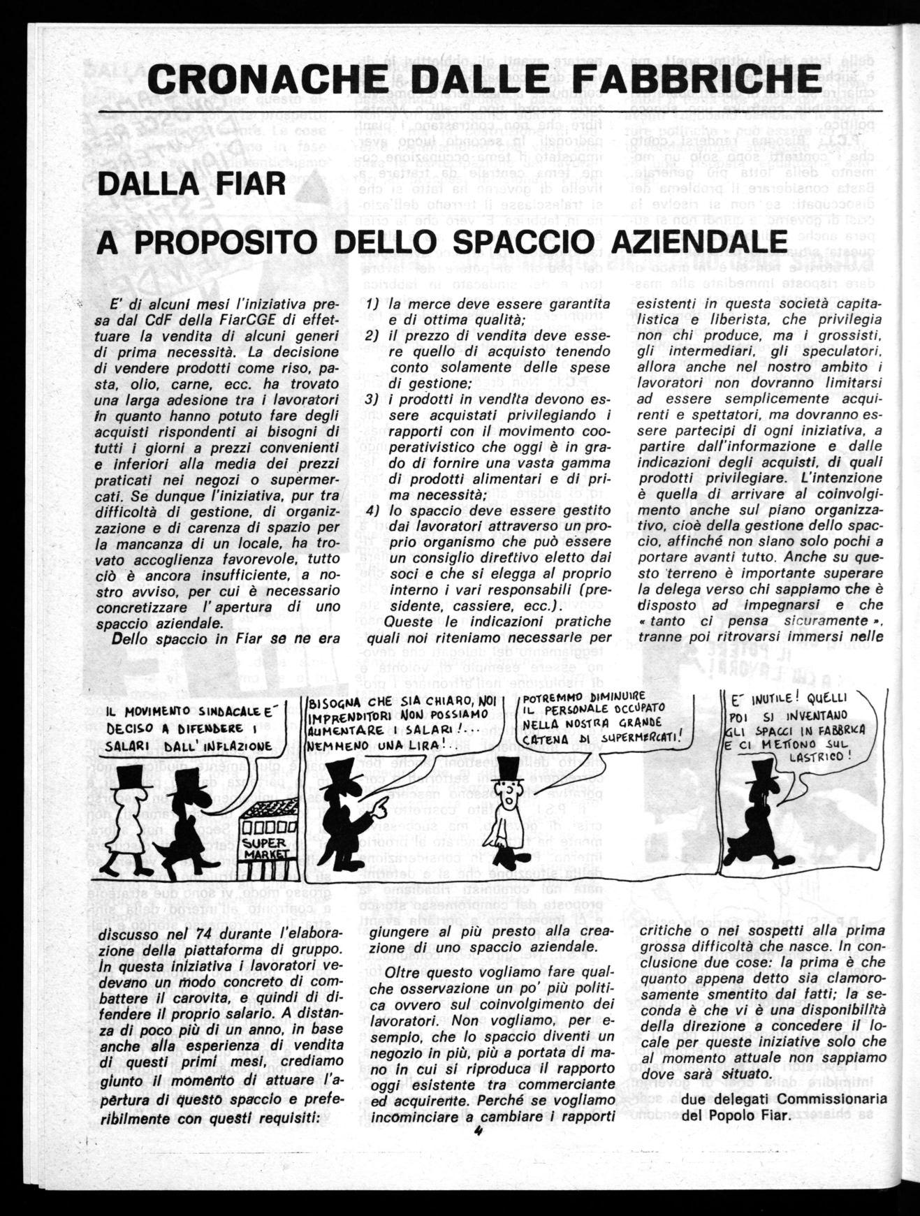 discusso nel ?4 durante l'elaborazione della piattaforma di gruppo. In questa iniziativa i lavoratori vedevano un modo concreto di combattere il carovita, e quindi di difendere il proprio salario. A distanza di poco più di un anno, in base anche alla esperienza di vendita di questi primi mesi, crediamo giunto il momento di attuare l'apértura di questo spaccio e preferibilmente con questi requisiti: