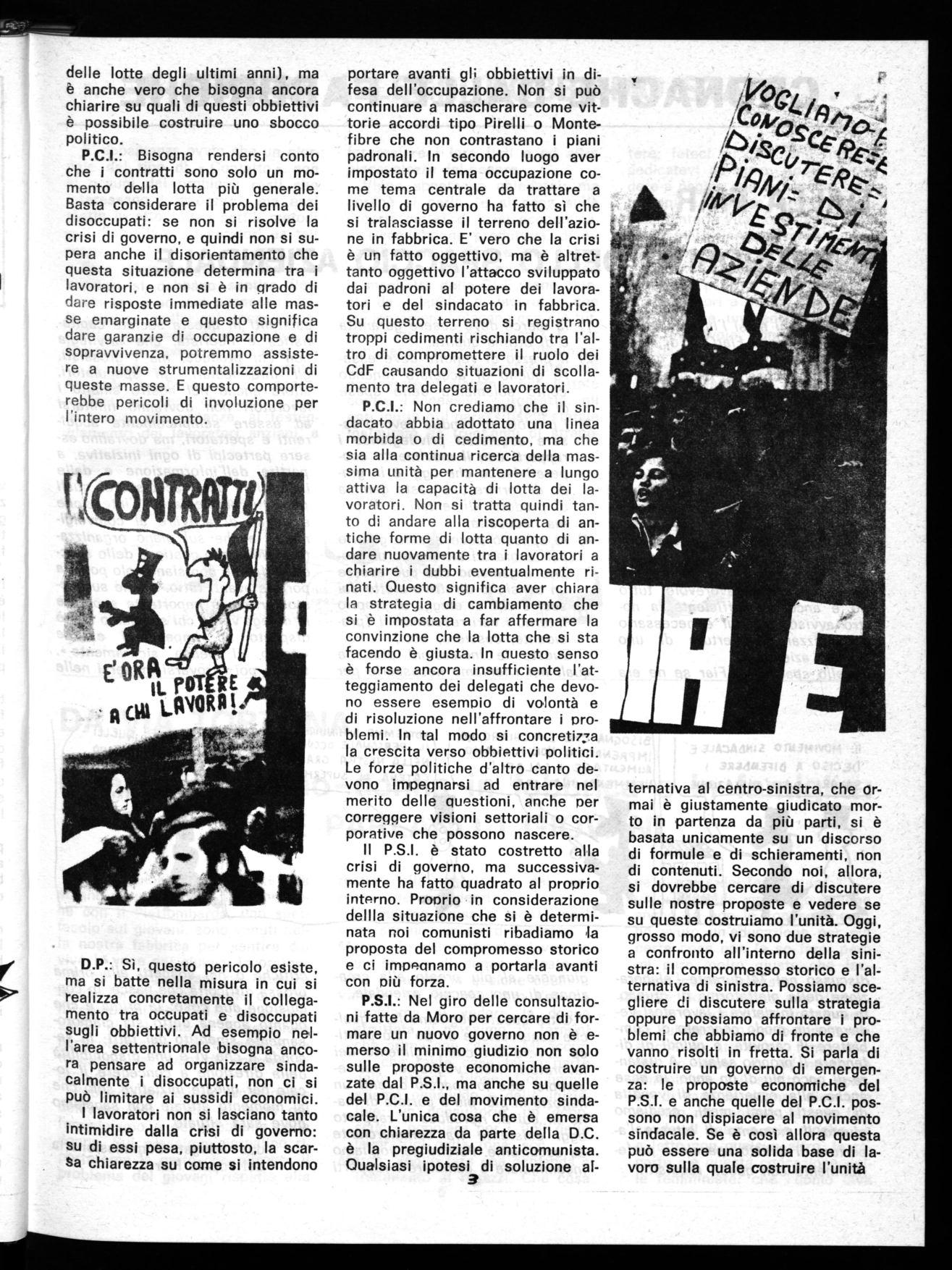 D.P.: Le contraddizioni e le divergenze oggi presenti all'interno della sinistra hanno indubbiamente un riflesso sullo stato del movimento. Va detto però che tali divergenze, anche se si sono ufficializzate solo dopo la caduta di Moro, erano presenti da tempo e hanno pesato anche sulla definizione della piattaforma. Infatti è vero che la parte della piattaforma relativa agli investimenti e al controllo operaio sulla produzione rappresenta il salto qualitativo dell'elaborazione del movimento (frutto