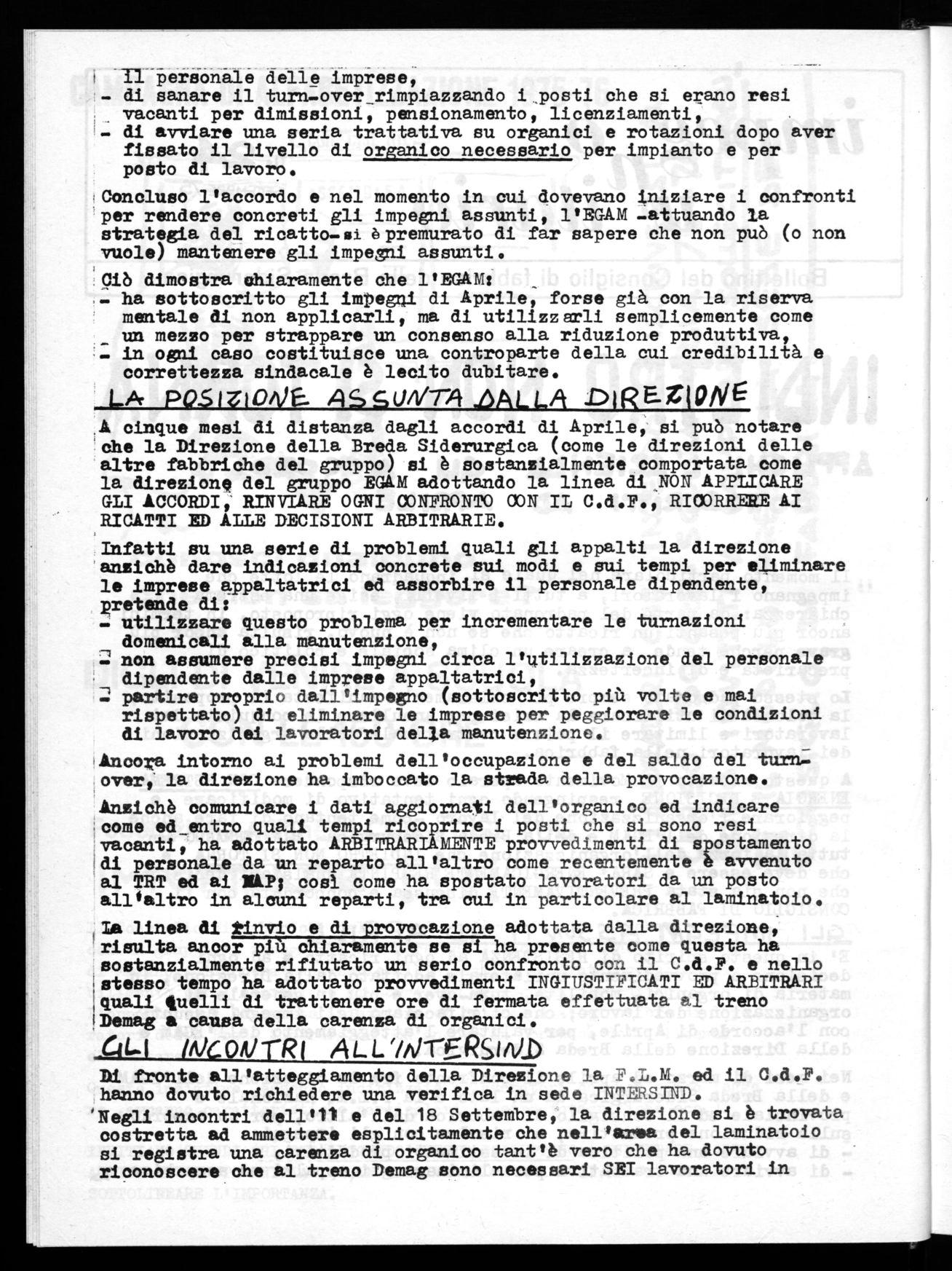A cinque mesi di distanza dagli accordi di Aprile, si può notare 'che la Direzione della Breda Siderurgica (come le direzioni delle altre fabbriche del gruppo) si è sostanzialmente comportata come la direzione del gruppo EGAM adottando la linea di NON APPLICARE