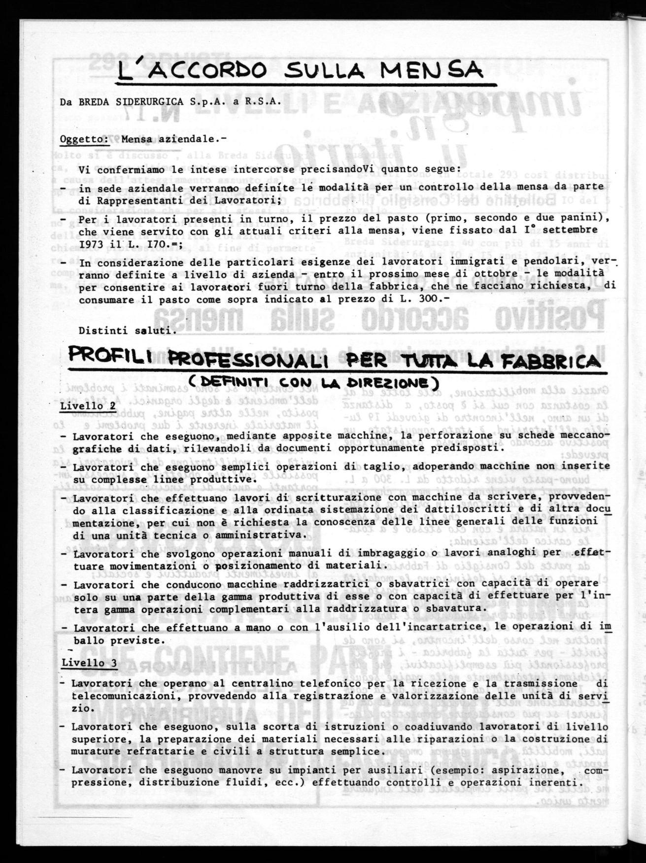 Per i lavoratori presenti in turno, il prezzo del pasto (primo, secondo e due panini), che viene servito con gli attuali criteri alla mensa, viene fissato dal I° settembre 1973 il L. I70.=;