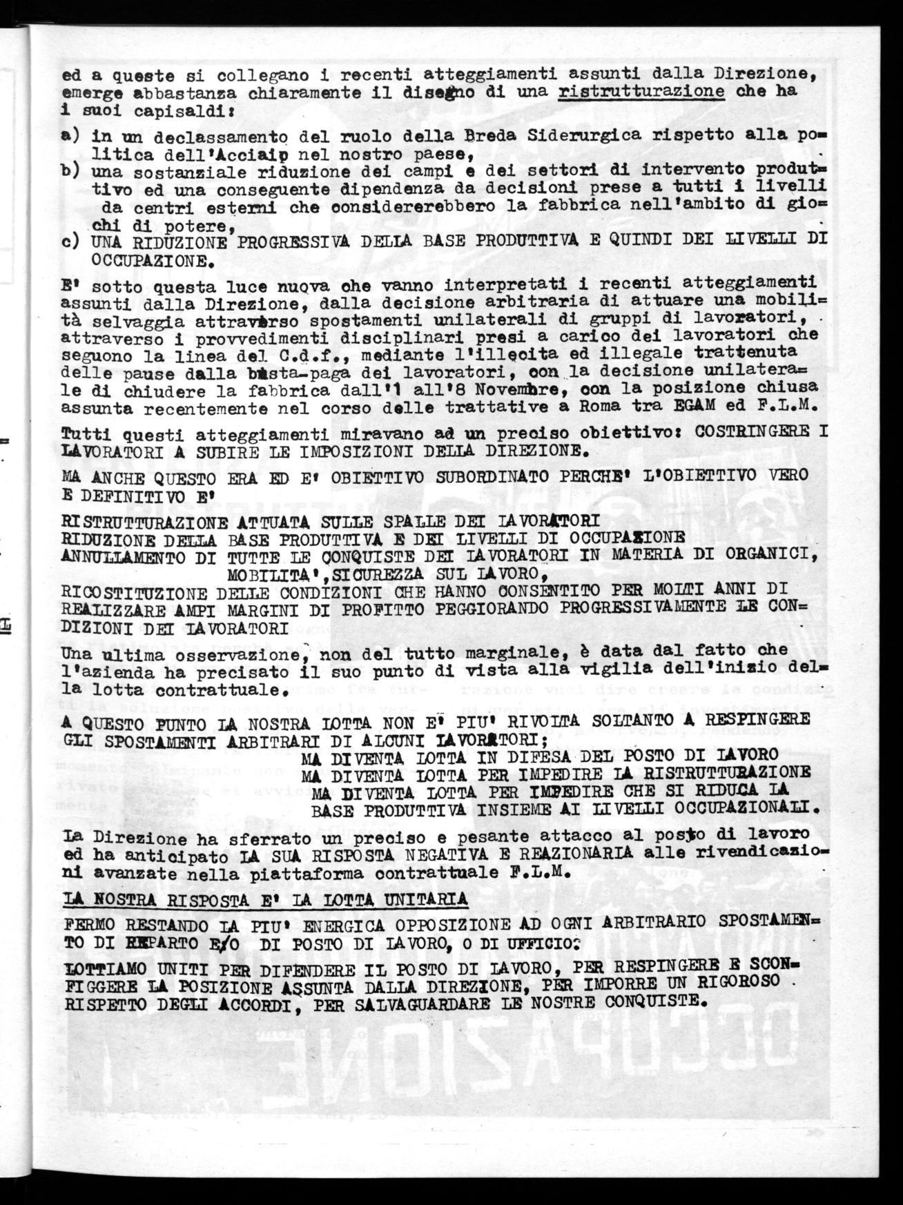 E' sotto questa luce nuova che vanno interpretati i recenti atteggiamenti assunti dalla Direzione, dalla decisione arbitraria di attuare una mobili= tà selvaggia attravirso spostamenti unilaterali di gruppi di lavoratori, attraverso i provvedimenti disciplinari presi a carico dei lavoratori che seguono la linea del. C.d.f., mediante l'illecita ed illegale trattenuta delle pause dalla bAsta-paga dei lavoratori, con la decisione unilatera= le di chiudere la falThrica dall'i alle8 Novembre, con la posizione chiusa assunta recentemente nel corso delle trattative a Roma tra EGAM ed F.L.M.