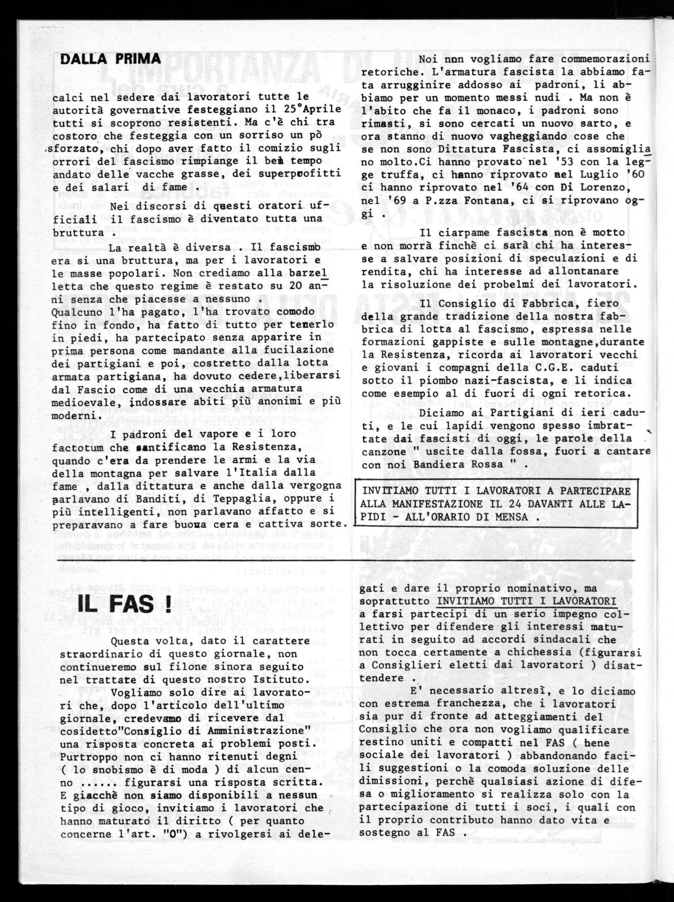 E' necessario altresì, e lo diciamo con estrema franchezza, che i lavoratori sia pur di fronte ad atteggiamenti del Consiglio che ora non vogliamo qualificare restino uniti e compatti nel FAS ( bene sociale dei lavoratori ) abbandonando facili suggestioni o la comoda soluzione delle dimissioni, perchè qualsiasi azione di difesa o miglioramento si realizza solo con la partecipazione dí tutti i soci, i quali con il proprio contributo hanno dato vita e sostegno al FAS .