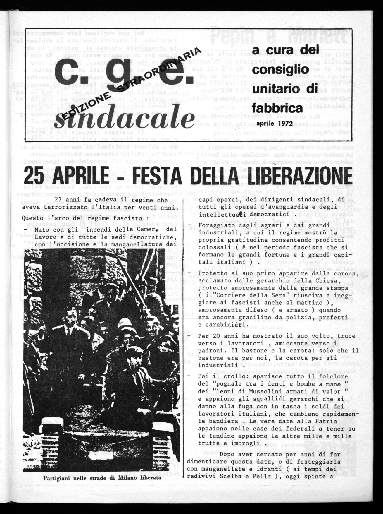 Il Consiglio di Fabbrica, fiero della grande tradizione della nostra fabbrica di lotta al fascismo, espressa nelle formazioni gappiste e sulle montagne,durante la Resistenza, ricorda ai lavoratori vecchi e giovani i compagni della C.G.E. caduti sotto il piombo nazi-fascista, e li indica come esempio al di fuori di ogni retorica.