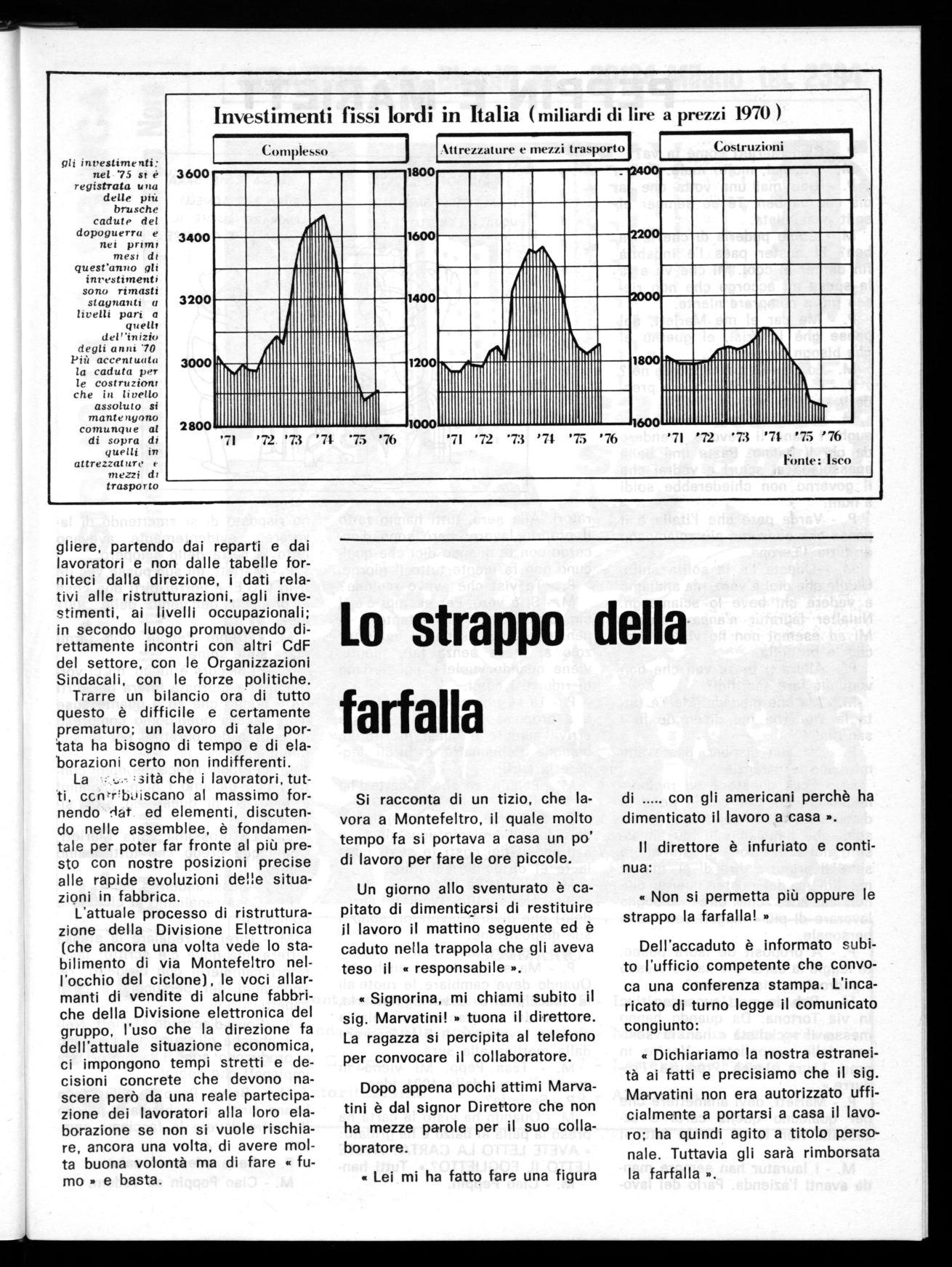 L'attuale processo di ristrutturazione della Divisione Elettronica (che ancora una volta vede lo stabilimento di via Montefeltro nell'occhio del ciclone), le voci allarmanti di vendite di alcune fabbriche della Divisione elettronica del gruppo, l'uso che la direzione fa dell'attuale situazione economica, ci impongono tempi stretti e decisioni concrete che devono nascere però da una reale partecipazione dei lavoratori alla loro elaborazione se non si vuole rischiare, ancora una volta, di avere molta buona volontà ma di fare « fumo » e basta.