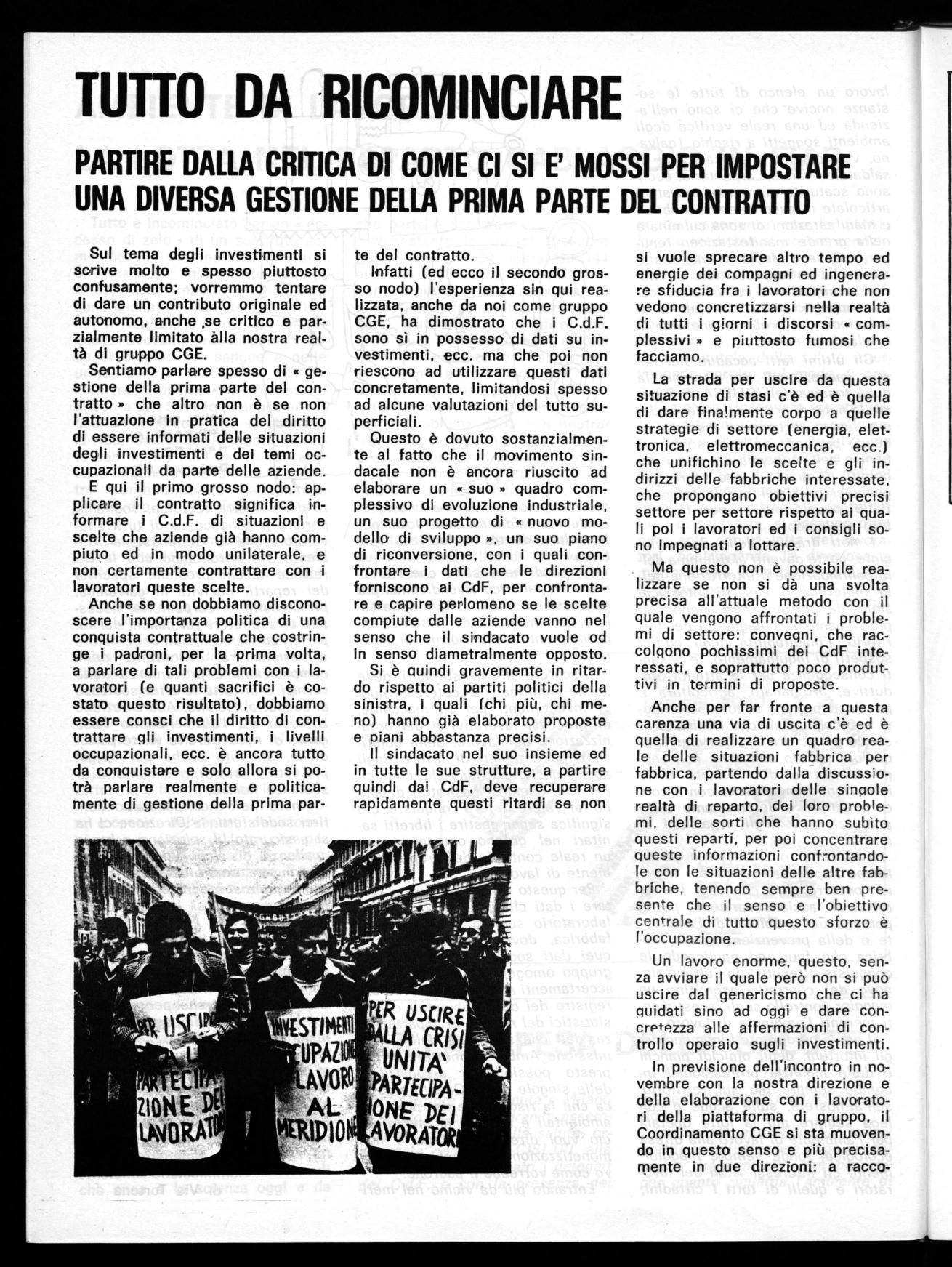 Anche se non dobbiamo disconoscere l'importanza politica di una conquista contrattuale che costringe i padroni, per la prima volta, a parlare di tali problemi con i lavoratori (e quanti sacrifici è costato questo risultato), dobbiamo essere consci che il diritto di contrattare gli investimenti, i livelli occupazionali, ecc. è ancora tutto da conauistare e solo allora si potrà parlare realmente e politicamente di gestione della prima par-