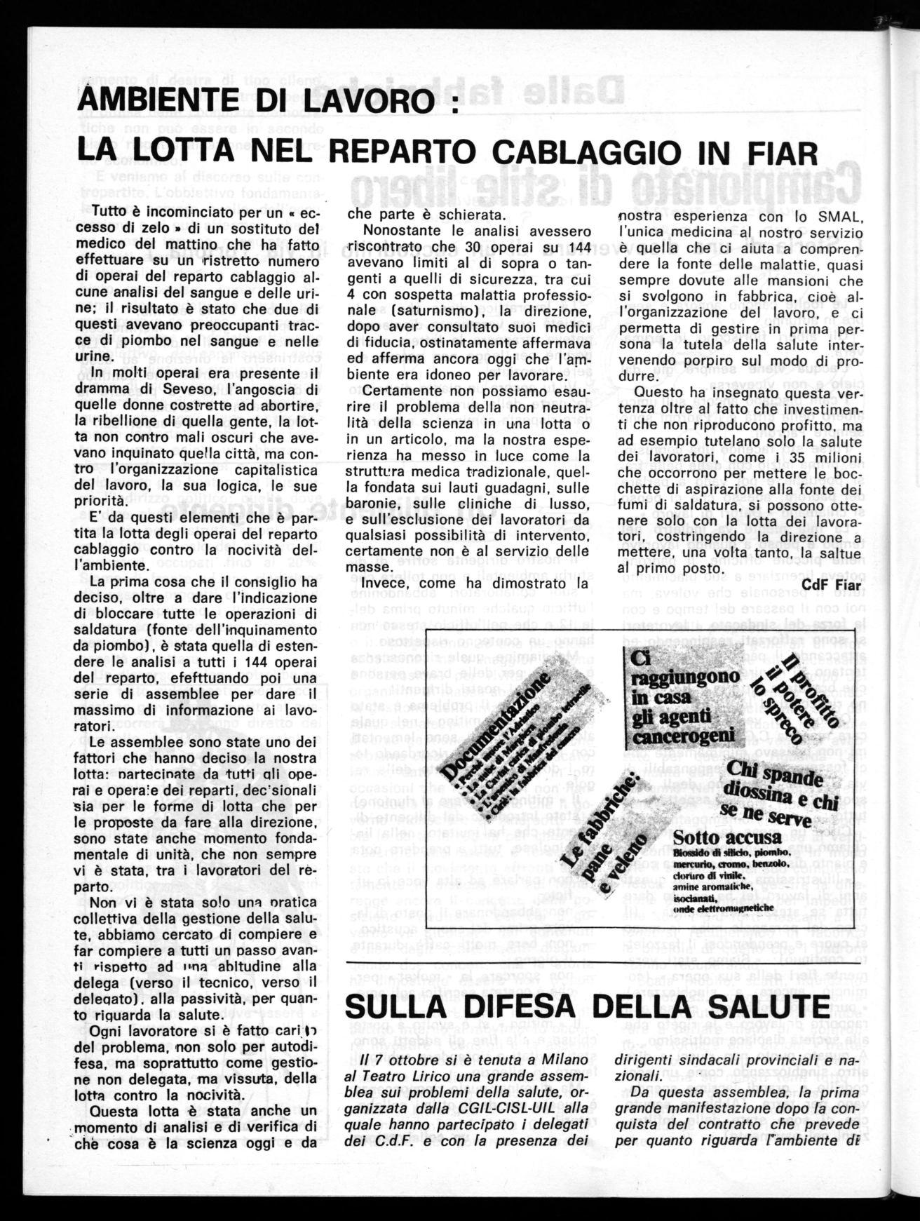 lavoro un elenco di tutte le sostanze nocive che ci sono nell'azienda ed una reale verifica degli ambienti soggetti a rischio (galvano, verniciatura, plastica. posti di saldatura, trance, carpenteria, ecc.) sono scaturite numerose iniziative articolate in assemblee di fabbrica e manifestazioni di zona culminate nella grande manifestazioen tenutasi a Cesano Maderno; manifestazione che ha rappresentato un momento importante ed un significativo impegno nella lotta per la risoluzione dei problemi inerenti la tutela della salute.