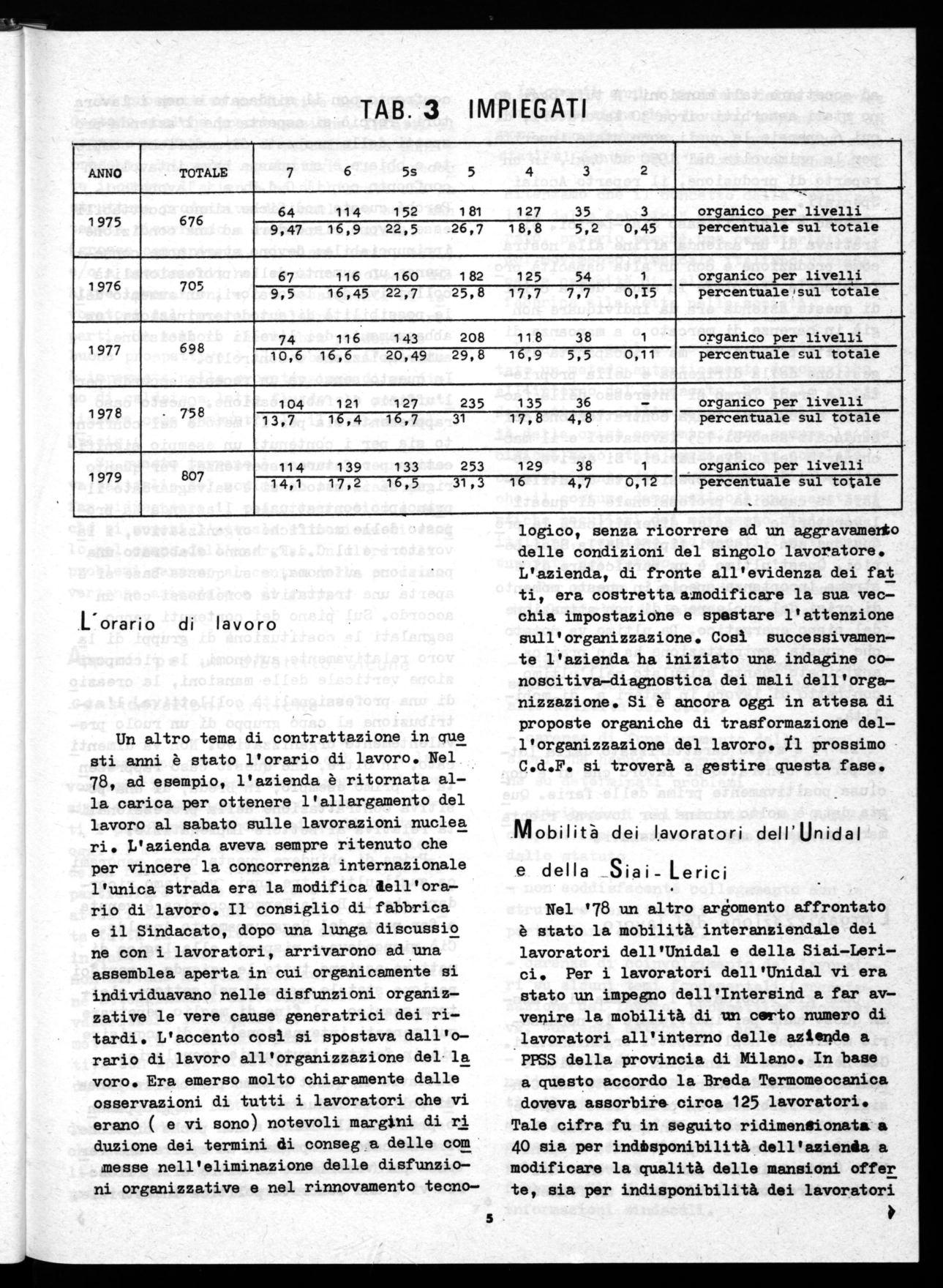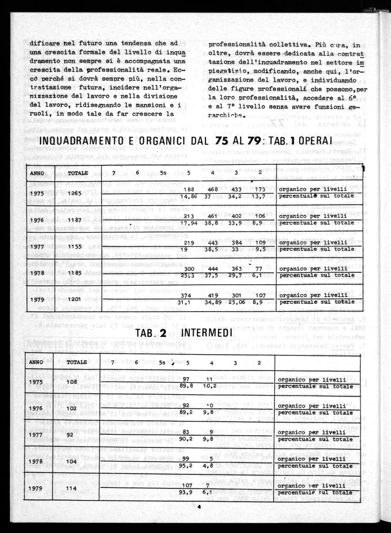 ANNO TOTALE 7 6 5s , 5 4 3 2 1975 108 97 11 organico per livelli 89,8 10,2 percentuale sul totale 1976 102 92 10 organico per livelli 89,2 9,8 percentuale sul totale 1977 92 83 9 organico per livelli 90,2 9,8 percentuale sul totale 1978 104 99 5 organico per livelli 95,2 4,8 percentuale sul totale 1979 114 107 7 organico :.er livelli 93,9 6,1 percentuale sul totale 4