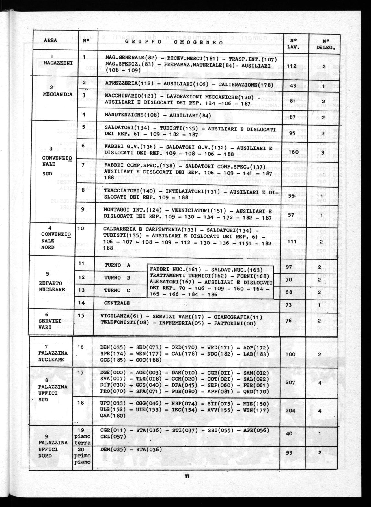 AREA N° GRUPPO OMOGENEO N° LAV. N° DELEG. 1 MAGAZZENI 1 MAG.GENERALE(82) - RICEV.MERCI(181) - TRASP.INT.(107) MAG.SPEDIZ.(83) - PREPARAZ.MATERIALE(84)- AUSILIARI (108 - 109) 112 2 2 2 ATREZZERIA(112) - AUSILIARI(106) - CALIBRAZIONE(178) 43 1 MECCANICA 3 MACCHINARIO(123) - LAVORAZIONI MECCANICHE(120)AUSILIARI E DISLOCATI DEI REP. 124 -106 - 187 81 2 4 MANUTENZIONE(108) - AUSILIARI(84) 87 2 5 SALDATORI(134) - TUBISTI(135) - AUSILIARI E DISLOCATI DEI REP. 61 - 109 - 182 - 187 2 95 3 CONVENZIO 6 FABBRI G.V.(136) - SALDATORI G.V.(132) - AUSILIARI E DISLOCATI DEI REP. 109 - 108 - 106 - 188 3 160 NALE SUD 7 FABBRI COMP.SPEC.(138) - SALDATORI COMP.SPEC.(137) AUSILIARI E DISLOCATI DEI REP. 106 - 109 - 141 - 187 188 8 TRACCIATORI(140) - INTELAIATORI(131) - AUSILIARI E DISLOCATI DEI REP. 109 - 188 1 55 9 MONTAGGI INT.(124) - VERNICIATORI(151) - AUSILIARI E DISLOCATI DEI REP. 109 - 130 - 134 - 172 - 182 - 187 57 1 4 CONVENZIO NALE NORD 10 CALDARERIA E CARPENTERIA(133) - SALDATORI(134)TUBISTI(135) - AUSILIARI E DISLOCATI DEI REP. 61106 - 107 - 108 - 109 - 112 - 130 - 136 - 1151 - 182 188 111 2 I 11 TURNO A FABBRI NUC.(161) - SALDAT.NUC.(163) 97 2 5 REPARTO 12 TURNO B TRATTAMENTI TERMICI(162) - F FORNI(168) ALESATORI(167) - AUSILIARI E DISLOCATI 70 2 NUCLEARE 13 TURNO C DEI REP. 70 - 106 - 109 - 160 - 164165 - 166 - 184 - 186 68 2 14 CENTRALE 73 1 6 SERVIZI VARI 15 VIGILANZA(61) - SERVIZI VARI(17) - CIANOGRAFIA(11) TELEFONISTI(08) - INFERMERIA(05) - FATTORINI(00) 76 2 7 PALAZZINA NUCLEARE 16 DEN(035) - SED(073) -