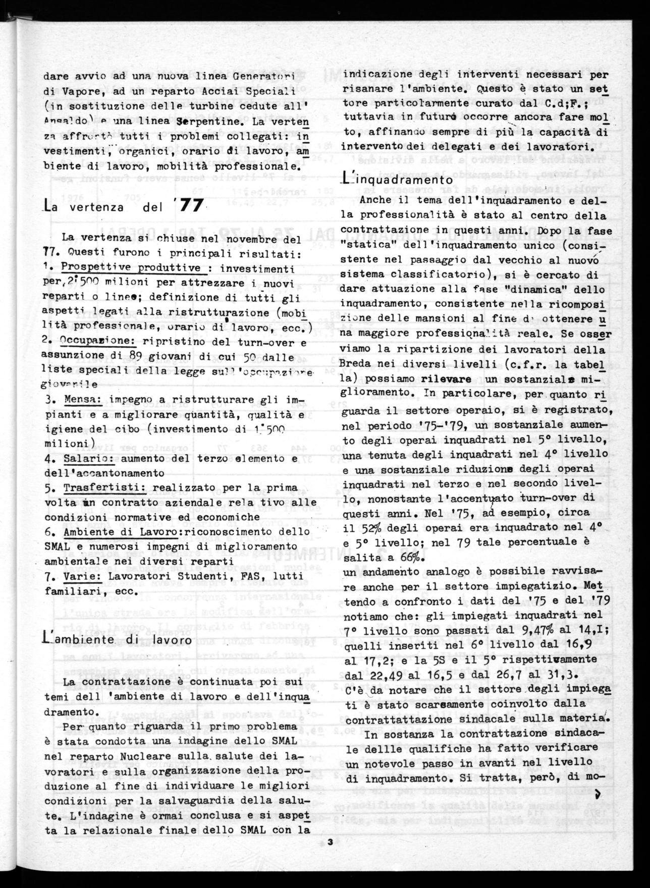 A ciò si aggiunga che in questo momento le aziende si stanno rapidamente trasformando: ristrutturazioni, modifiche organiz zative, innovazioni tecnologiche, decentra mento di parti del ciclo produttivo. Soprattutto la Breda Termomeccanica sta portando avanti dei processi di modifica dell'organizzazione del lavoro e di introduzione massiccia del calcolatore elettronico in molte aree di produzione e molte attività impiegatizie. Anche su questo terreno occorre che il Consiglio di Fabbrica che andiamo ad eleggere sia capace di eser citare, insieme al lavoratori, un rigoroso controllo delle trasformazioni e di porre degli obiettivi di miglioramento della professionalità colllettiva dei lavoratori.