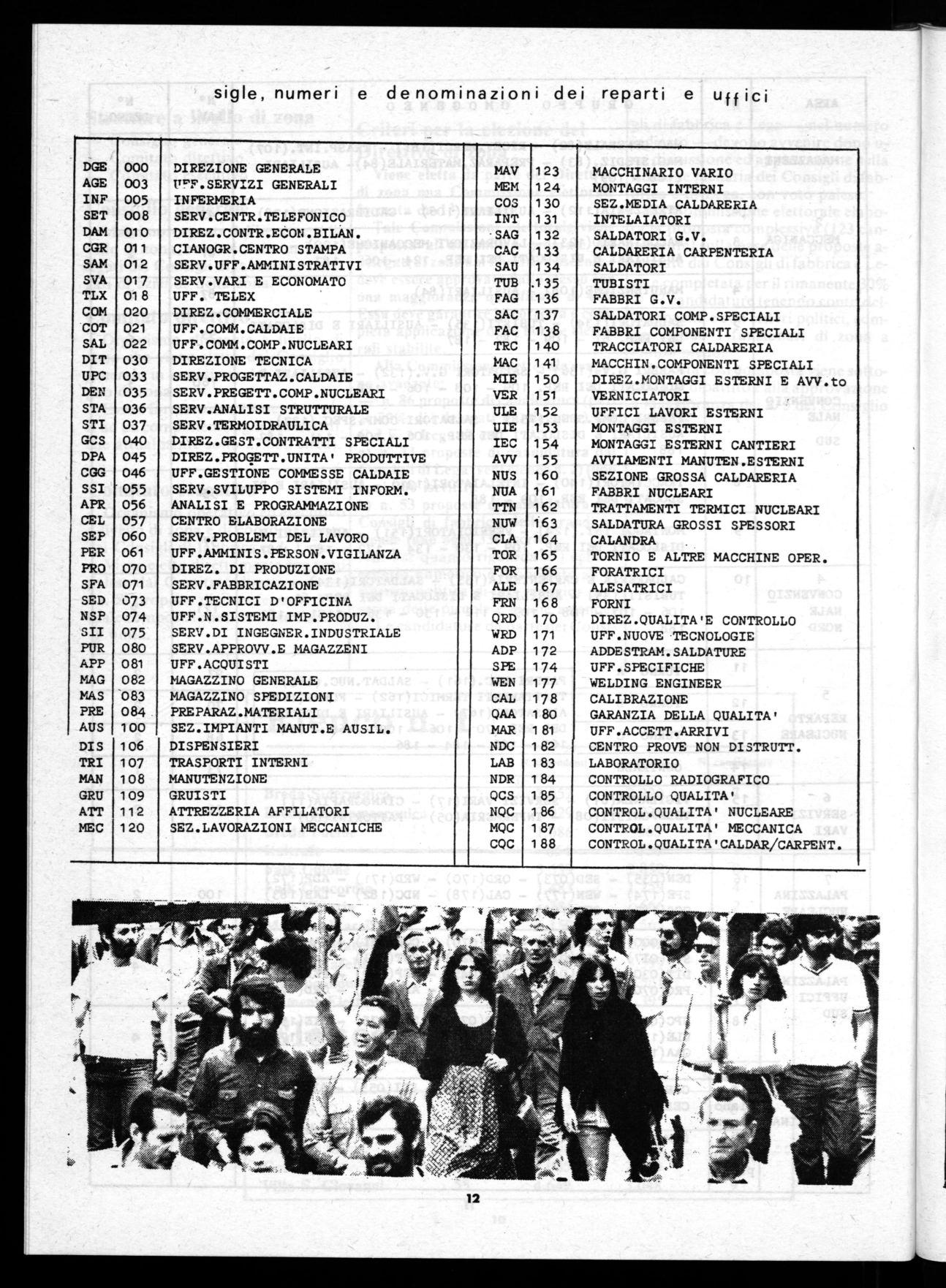 DGE 000 DIREZIONE GENERALE MAV 123 MACCHINARIO VARIO AGE 003 1TvT.SERVIZI GENERALI MEM 124 MONTAGGI INTERNI INF 005 INFERMERIA CO3 130 SEZ.MEDIA CALDARERIA SET 008 SERV.CENTR.TELEFONICO INT 131 INTELAIATORI DAM 010 DIREZ.CONTR.ECON.BILAN. SAG 132 SALDATORI G.V. CGR 011 CIANOGR.CENTRO STAMPA CAC 133 CALDARERIA CARPENTERIA SAM 012 SERV.UFF.AMMINISTRATIVI SAU 134 SALDATORI SVA 017 SERV.VARI E ECONOMATO TUB .135 TUBISTI TLX 018 UFF. TELEX FAG 136 FABBRI G.V. COM 020 DIREZ.COMMERCIALE SAC 137 SALDATORI COMP.SPECIALI COT 021 UFF.COMM.CALDAIE FAC 138 FABBRI COMPONENTI SPECIALI SAL 022 UFF.COMM.COMP.NUCLEARI TRC 140 TRACCIATORI CALDARERIA DIT 030 DIREZIONE TECNICA MAC 141 MACCHIN.COMPONENTI SPECIALI UPC 033 SERV.PROGETTAZ.CALDAIE MIE 150 DIREZ.MONTAGGI ESTERNI E AVV.to DEN 035 SERV.PREGETT.COMP.NUCLEARI VER 151 VERNICIATORI STA 036 SERV.ANALISI STRUTTURALE ULE 152 UFFICI LAVORI ESTERNI STI 037 SERV.TERMOIDRAULICA UIE 153 MONTAGGI ESTERNI GCS 040 DIREZ.GEST.CONTRATTI SPECIALI IEC 154 MONTAGGI ESTERNI CANTIERI DPA 045 DIREZ.PROGETT.UNITA' PRODUTTIVE AVV 155 AVVIAMENTI MANUTEN.ESTERNI CGG 046 UFF.GESTIONE COMMESSE CALDAIE NUS 160 SEZIONE GROSSA CALDARERIA SSI 055 SERV.SVILUPPO SISTEMI INFORM. NUA 161 FABBRI NUCLEARI APR 056 ANALISI E PROGRAMMAZIONE TTN 162 TRATTAMENTI TERMICI NUCLEARI CEL 057 CENTRO ELABORAZIONE NUW 163 SALDATURA GROSSI SPESSORI SEP 060 SERV.PROBLEMI DEL LAVORO CLA 164 CALANDRA PER 061 UFF.AMMINIS.PERSON.VIGILANZA TOR 165 TORNIO E ALTRE MACCHINE OPER. PRO 070 DIREZ. DI PRODUZIONE FOR 166 FORATRICI SFA 071 SERV.FABBRICAZIONE ALE 167 ALESATRICI SED 073 UFF.TECNICI D'OFFICINA FRN 168 FORNI NSP 074 UFF.N.SISTEMI IMP.PRODUZ. QRD 170 DIREZ.QUALITA'E CONTROLLO SII 075 SERV.DI INGEGNER.INDUSTRIALE WRD 171 UFF.NUOVE TECNOLOGIE PUR 080 SERV.APPROVV.E MAGAZZENI ADP 172 ADDESTRAM.SALDATURE APP 081 UFF.ACQUISTI SPE 174 UFF.SPECIFICHE MAG 082 MAGAZZINO GENERALE WEN 177 WELDING ENGINEER MAS 083 MAGAZZINO SPEDIZIONI CAL 178 CALIBRAZIONE PRE 084 PREPARAZ.MATERIALI QAA 180 GARANZIA DELLA QUALITA' AUS 100 SEZ.IMPIANTI MANUT.E AUSIL. MAR 181 UFF.ACCETT.ARRIVI DIS 106 DISPENSIERI NDC 182 CENTRO PROVE NON DISTRUTT. TRI 107 TRASPORTI INTERNI LAB 183 LABORATORIO MAN 108 MANUTENZIONE NDR 184 CONTROLLO RADIOGRAFICO GRU 109 GRUISTI QCS 185 CONTROLLO QUALITA' ATT 112 ATTREZZERIA AFFILATORI NQC 186 CONTROL.QUALITA' NUCLEARE MEC 120 SEZ.LAVORAZIONI MECCANICHE MQC 187 CONTROL.QUALITA' MECCANICA CQC 188 CONTROL.QUALITA'CALDAR/CARPENT.