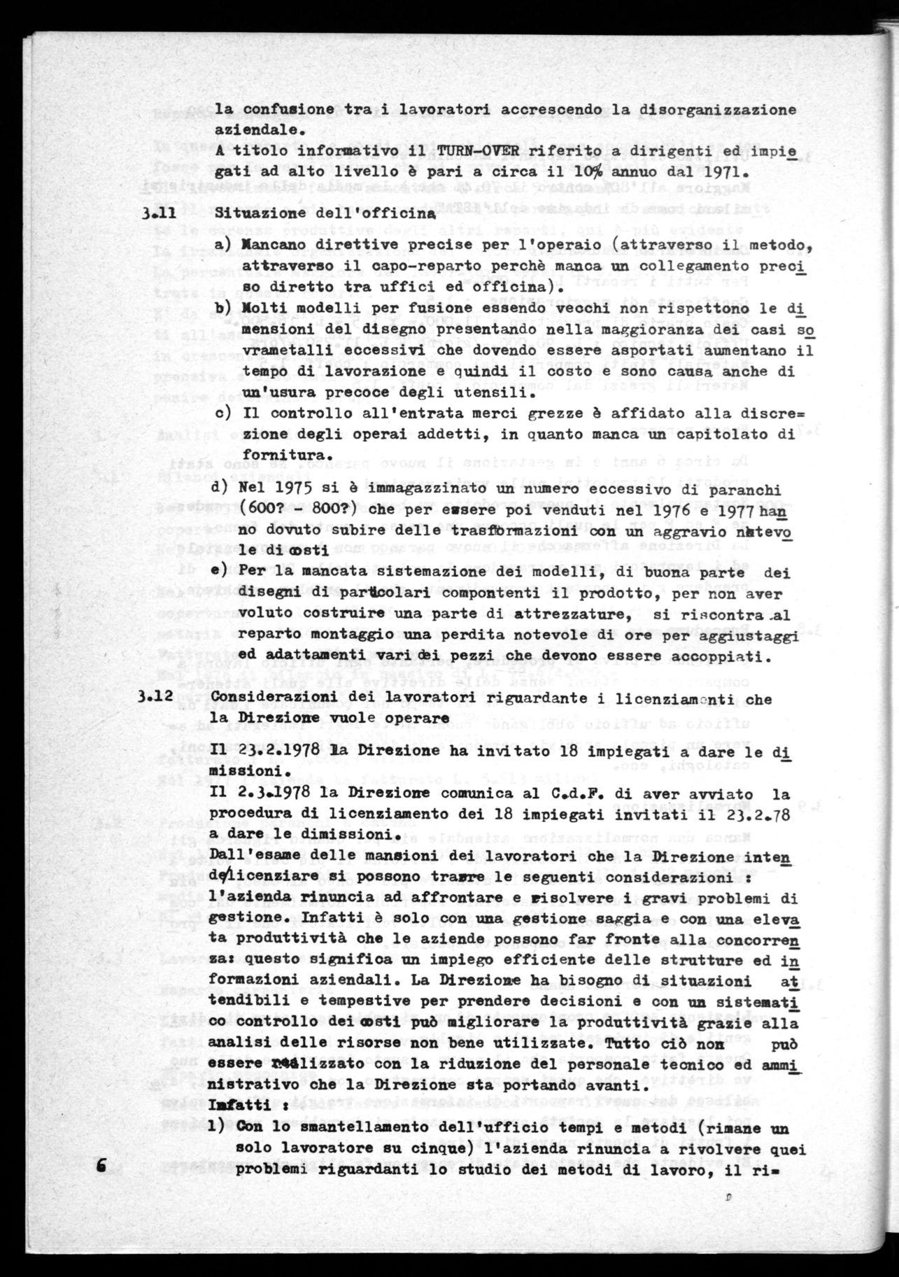Dal b• Gennaio 1978 al 28.2.1978 l'azienda ha aoquisito oom messe pari a circa 1/3 del fatturato dello scorso anno. Questo dato ci fa ritenere ingiustificato il motivo di man= causa di lavoro fin'ora dichiarato dalla Direzione al C.d.F. per motivare la Cassa Integrazione per gli operai ed il li= cenziamento per gli impiegati.