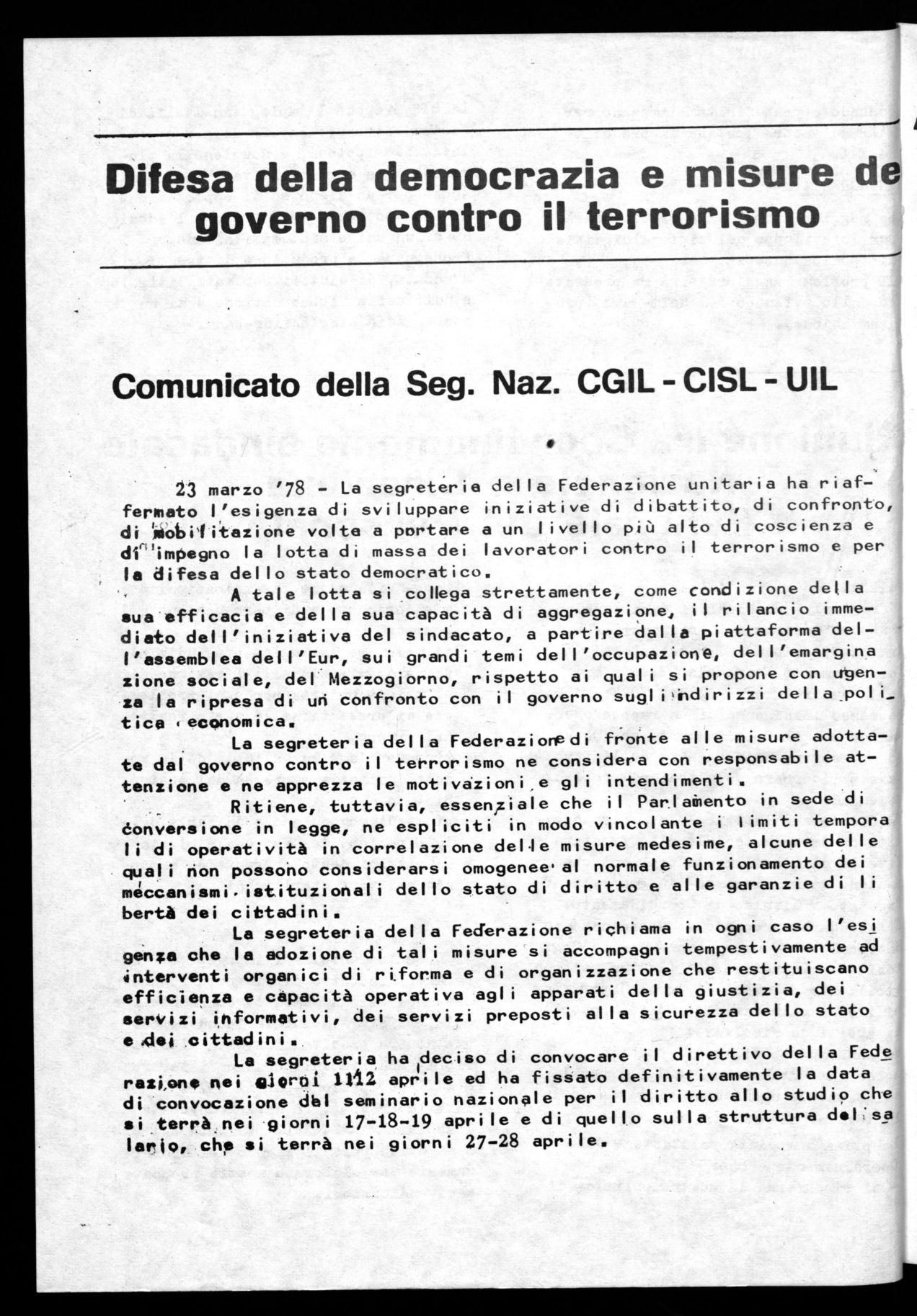 23 marzo '78 - La segreterie della Federazione unitaria ha riaffermato l'esigenza di sviluppare iniziative di dibattito, di confronto, di Wcbilitazione volte a portare a un livello più alto di coscienza e di"impegno la lotta di massa dei lavoratori contro il terrorismo e per la difesa dello stato democratico.