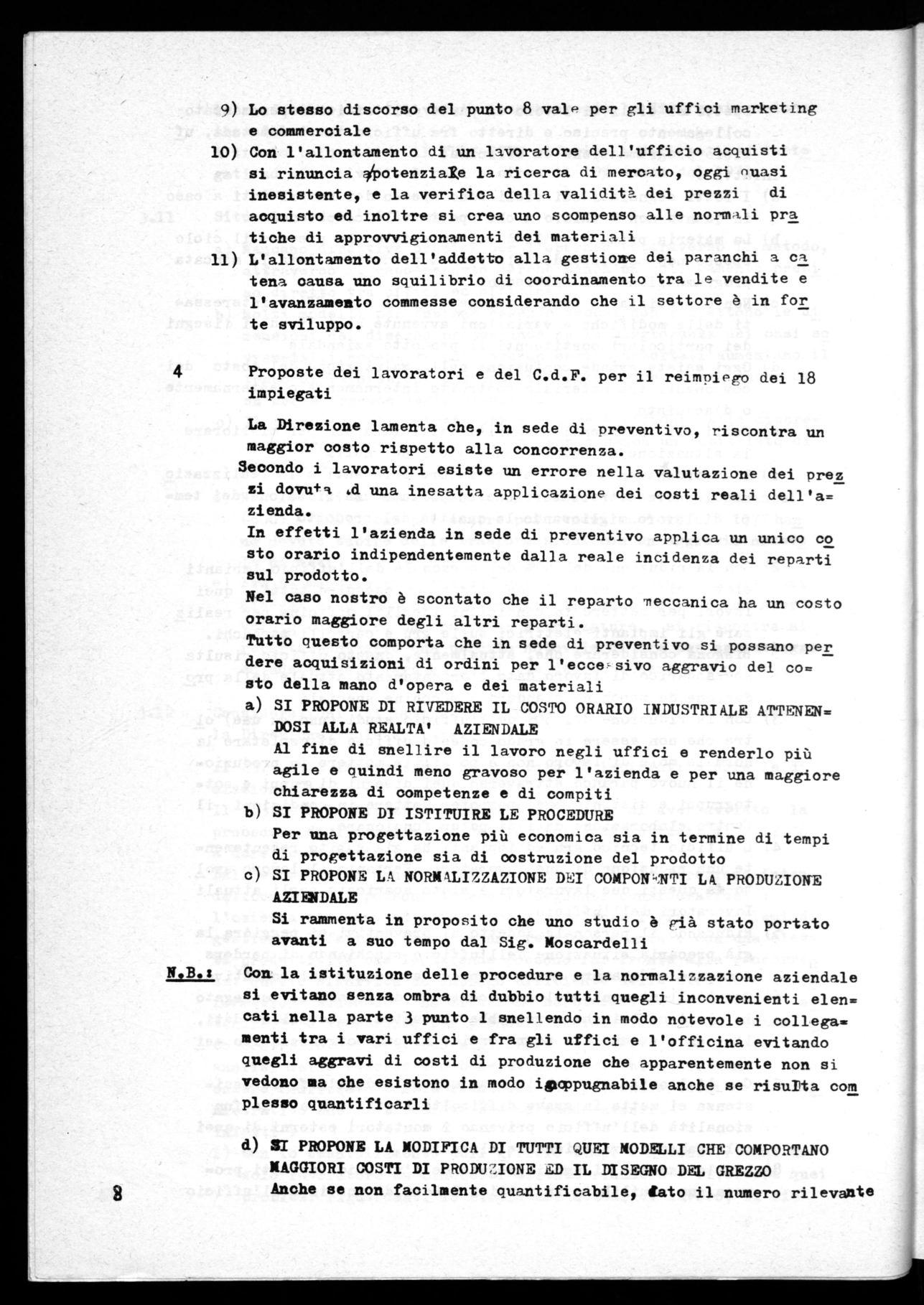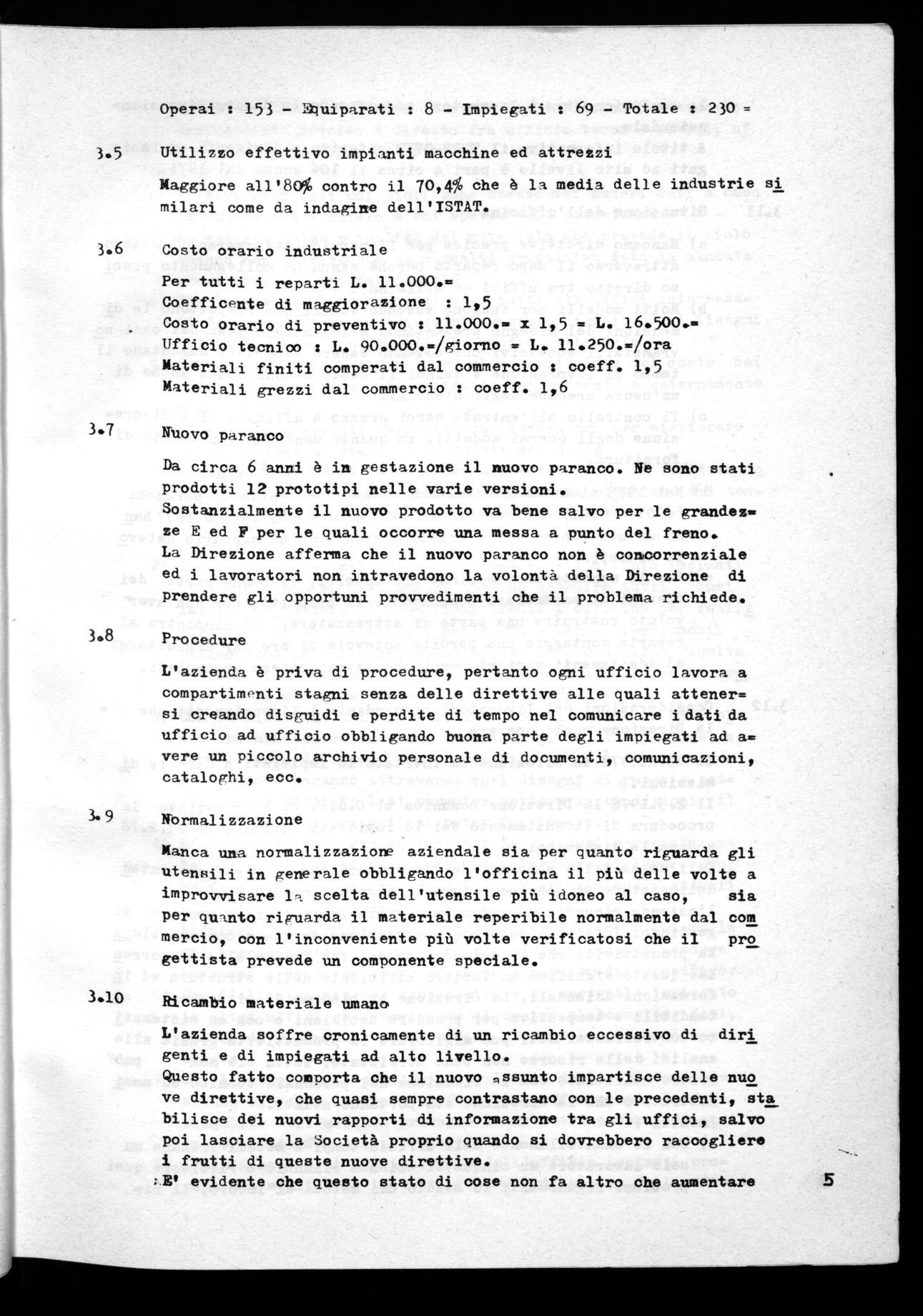 Gon la istituzione delle procedure e la normalizzazione aziendale si evitano senza ombra di dubbio tutti quegli inconvenienti elen= cati nella parte 3 punto 1 snellendo in modo notevole i collega= menti tra i vari uffici e fra gli uffici e l'officina evitando quegli aggravi di costi di produzione che apparentemente non si vedono ma che esistono in modo ignopugnabile anche se risulta com plesso qnantificarli