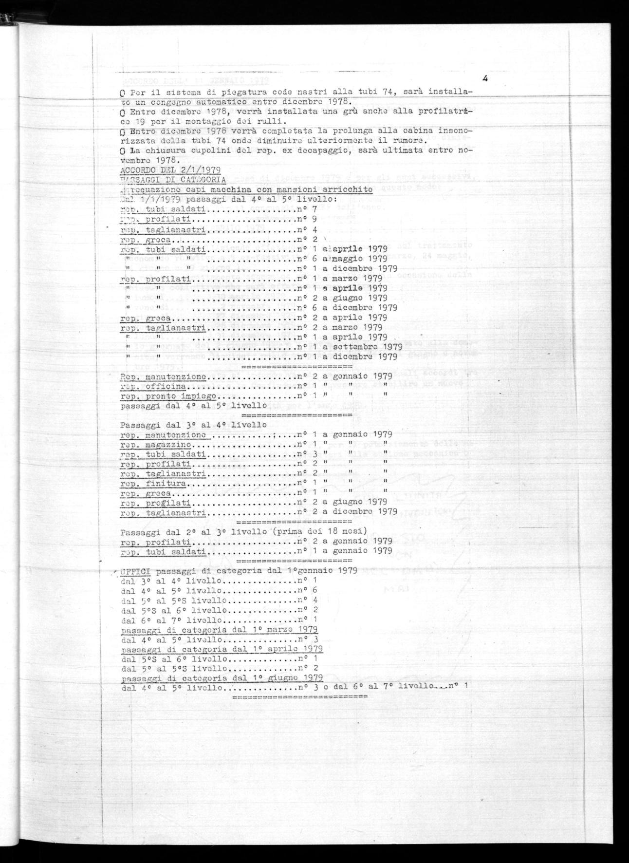 3 - Ribaltatori nastri, verranno costruiti ribaltatori automatici dei nastri per il reparto profilati di Salerno, analogo n quello sperimentato a Desio. La messa in funzione avverrà noi tempi più rapidi posaibili e comunque entro il mese di maggio 1979. Per quanto riguarda Devio la messa in funzione dei 7tribaltatori del reparto pro.':5.1ati avverrà .atro il mese di giugno 1979.-