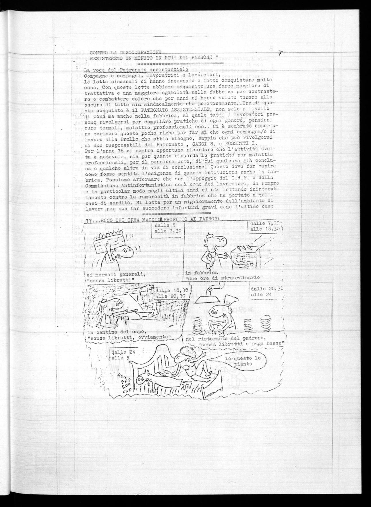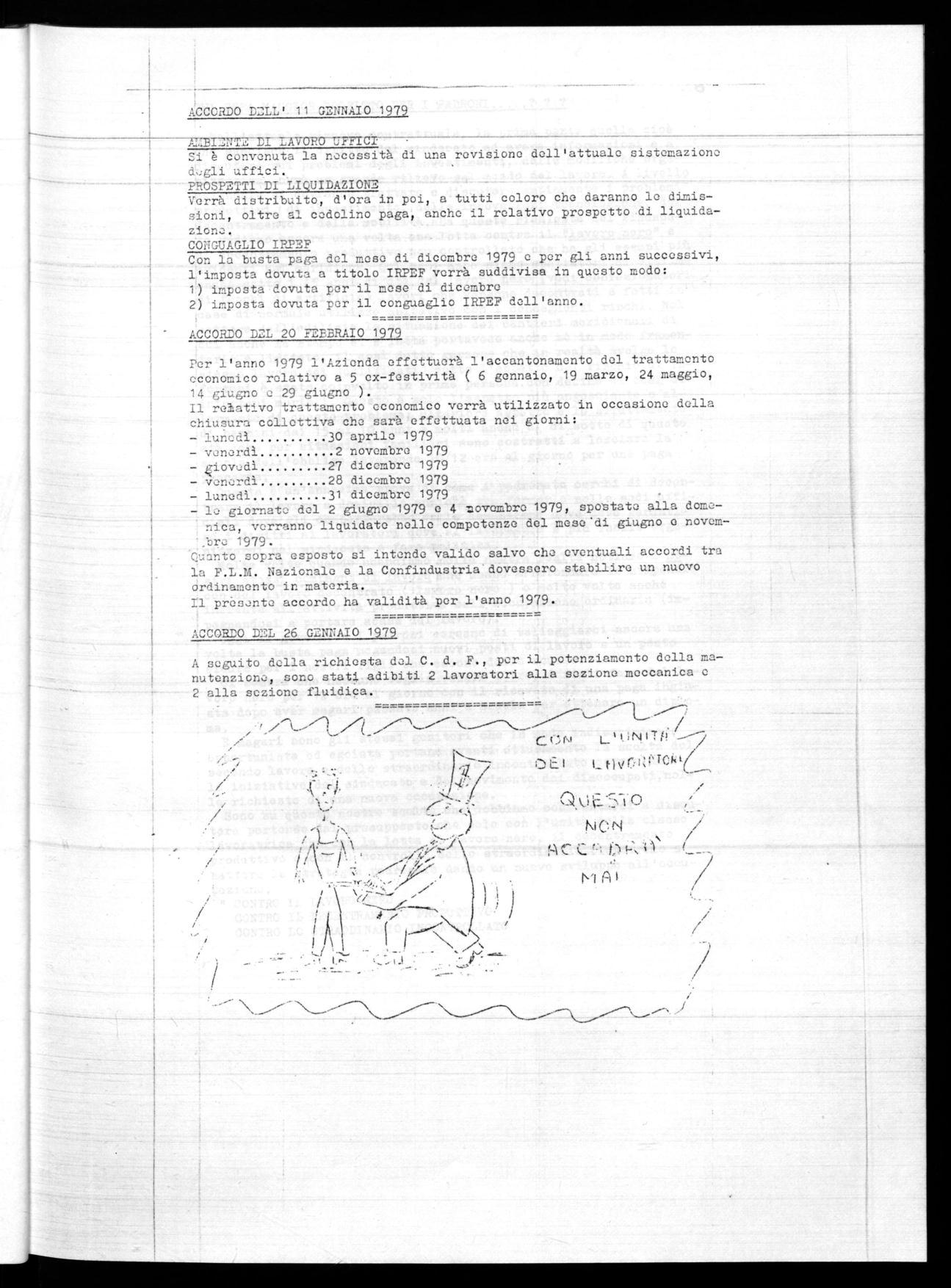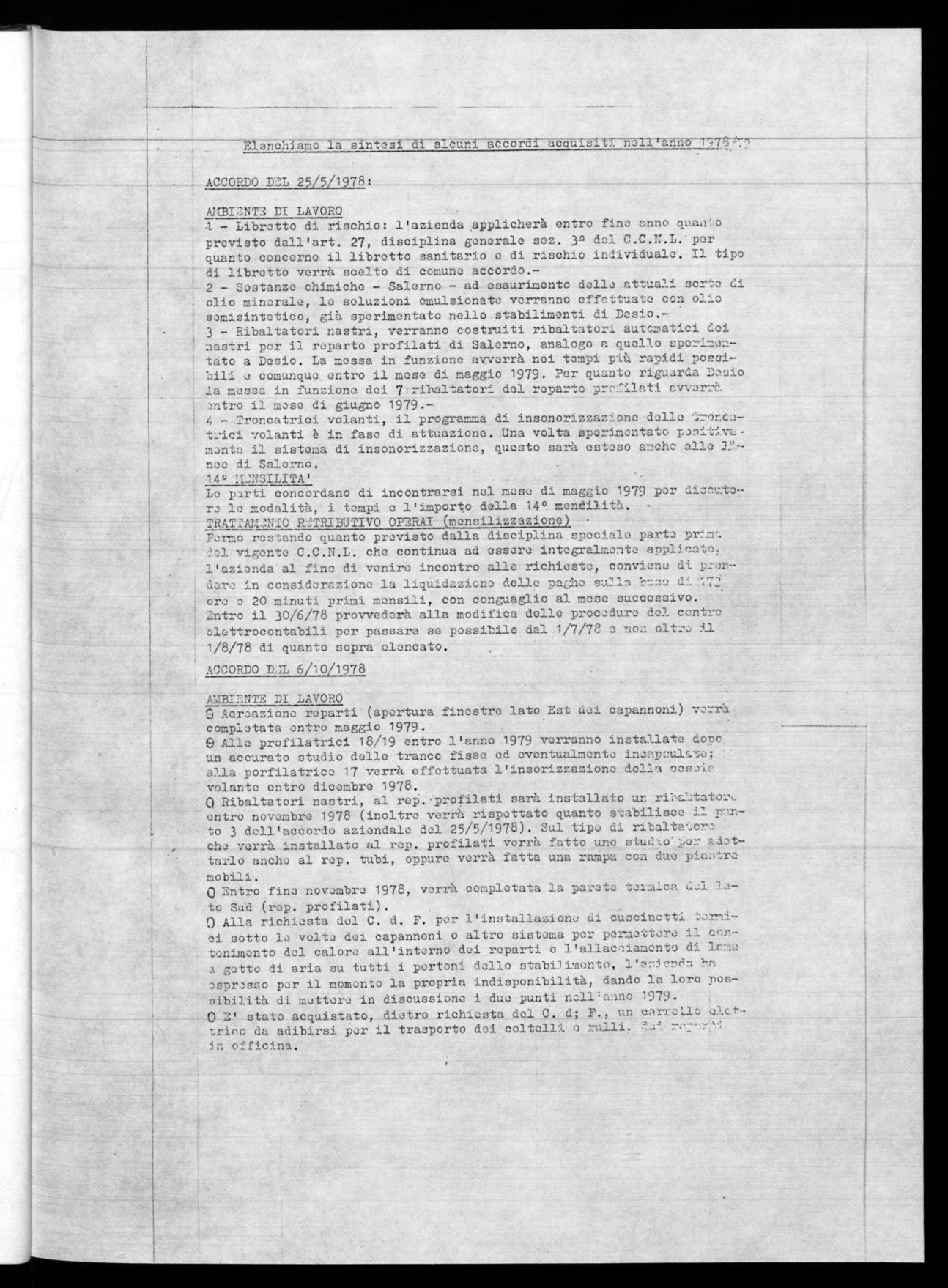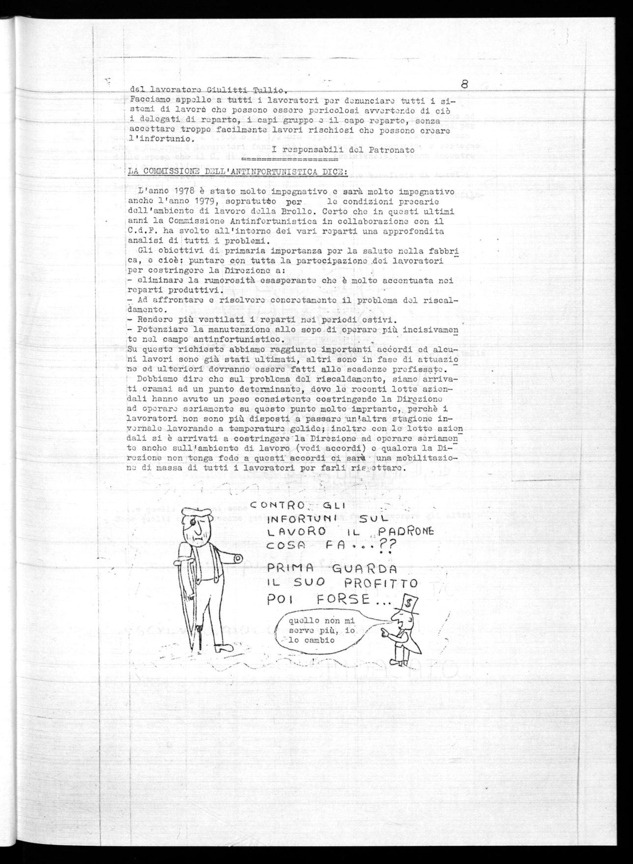 L'anno 1978 è stato molto impegnativo e sarà molto impegnativo anche l'anno 1979, sopratutto por le condizioni precarie dell'ambiente di lavoro della Brollo. Certo che in questi ultimi anni la Commissione Antinfortunistica in collaborazione con il C.d.F. ha svolto all'interno dei vari reparti una approfondita analisi di tutti i problemi.