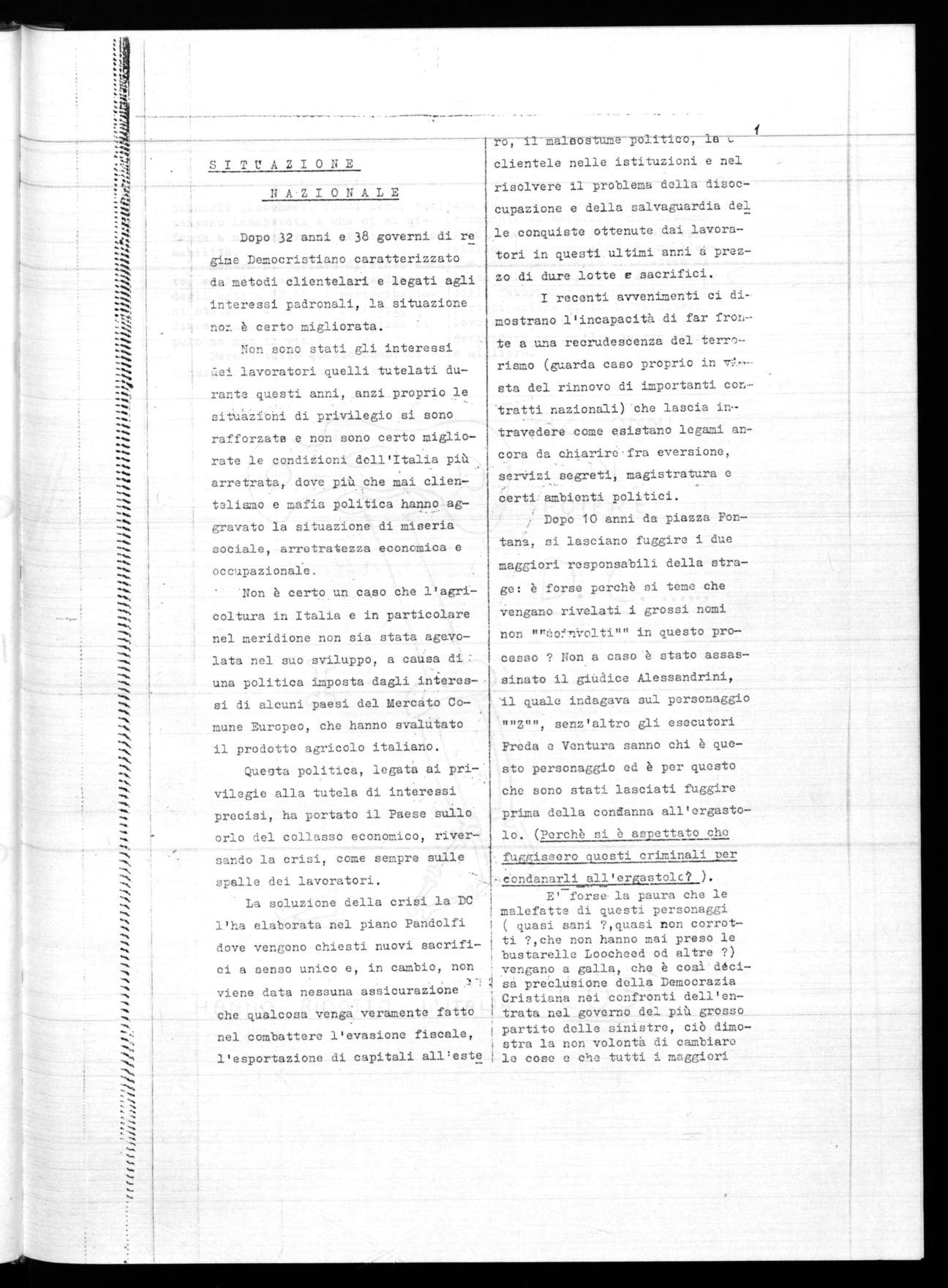 I recenti avvenimenti ci dimostrano l'incapacità di far fronte a una recrudescenza del terrorismo (guarda caso proprio in sta del rinnovo di importanti contratti nazionali) 'che lascia intravedere come esistano legami ancora da chiarire fra eversione, servizi segreti, magistratura e Certi ambienti politici.