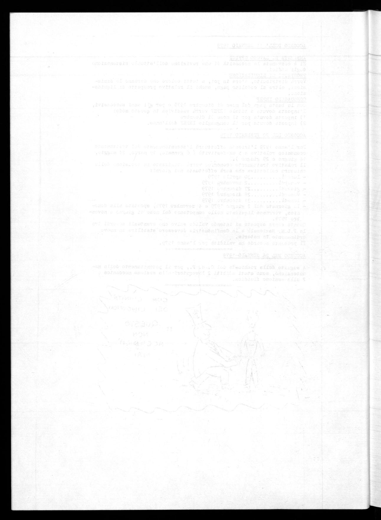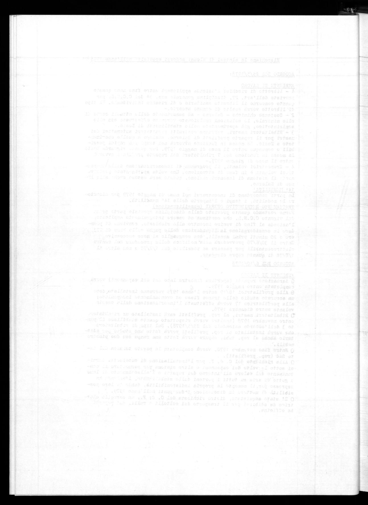Alla richiesta del C. d. F. per l'installazione di cuscinetti tornici sotto le volte dei capannoni o altro sistema per pormattera il cantonimento del calore all'interno dei reparti e l'allacaiamento di lomo e getto di aria su tutti i portoni dello stabi1imento, l'aaicren espresso par il momento la propria indisponibilità, dando la loro possibilità di mettere in discussione i due punti nell'anno 1979.