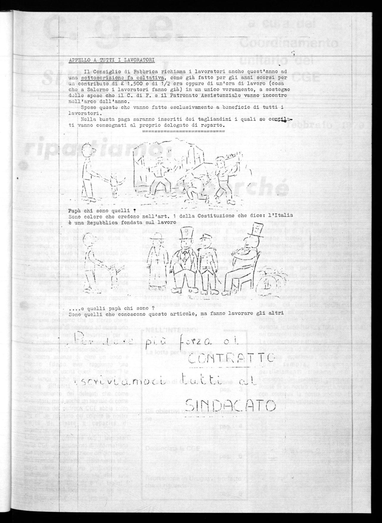 Il Consiglio di Fabbrica richiama i lavoratori anche quest'anno ad una sottoscrizione fa coltativa, come già fatto per gli anni scorsi per un contributo di £ 1.500 o di 1 /2 ora oppure di un'ora di lavoro (cosa che a Salerno i lavoratori fanno già) in un unico versamento, a sostegno delle spese che il C. di F. e il Patronato Assistenziale vanno incontro nell'arco dell'anno.